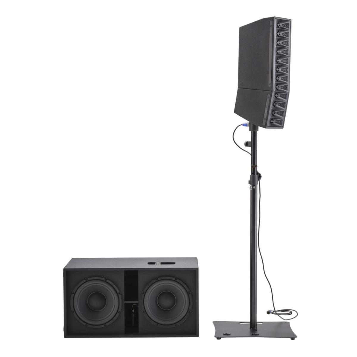 Optionaler Adapter für die MOJO Signature, um den Subwoofer mit dem Topteil per Kabel zu verbinden - ohne das Verbindungsrohr. Diese Konfiguration erlaubt es, den Subwoofer horizontal auf dem Boden/Bühne zu platzieren und das Topteil auf einem Lautsprecherstativ.