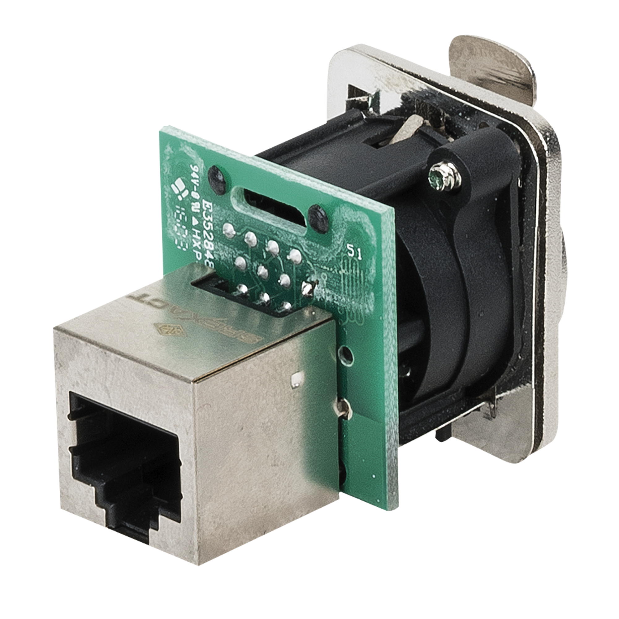 DAP Ethernet RJ45 D-size Chassis Feedthrough receptacle in D-sized metal flange with the secure latching system - Nickel - CAT5E Durchgangssteckdose mit Metallflansch (Größe D) und sicherem Verriegelungssystem Nickel