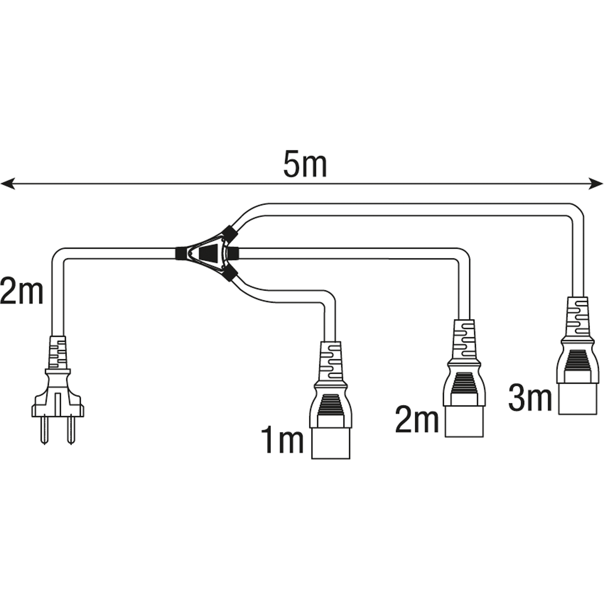 Das DAP Schuko zu PowerCON True1 TOP split 3-Wege (male) hat drei Kabel mit einer Länge von 1, 2 und 3 Metern. Damit können Sie drei Geräte, wie z. B. LED-Bildschirme und Moving Heads, an nur eine Steckdose anschließen.