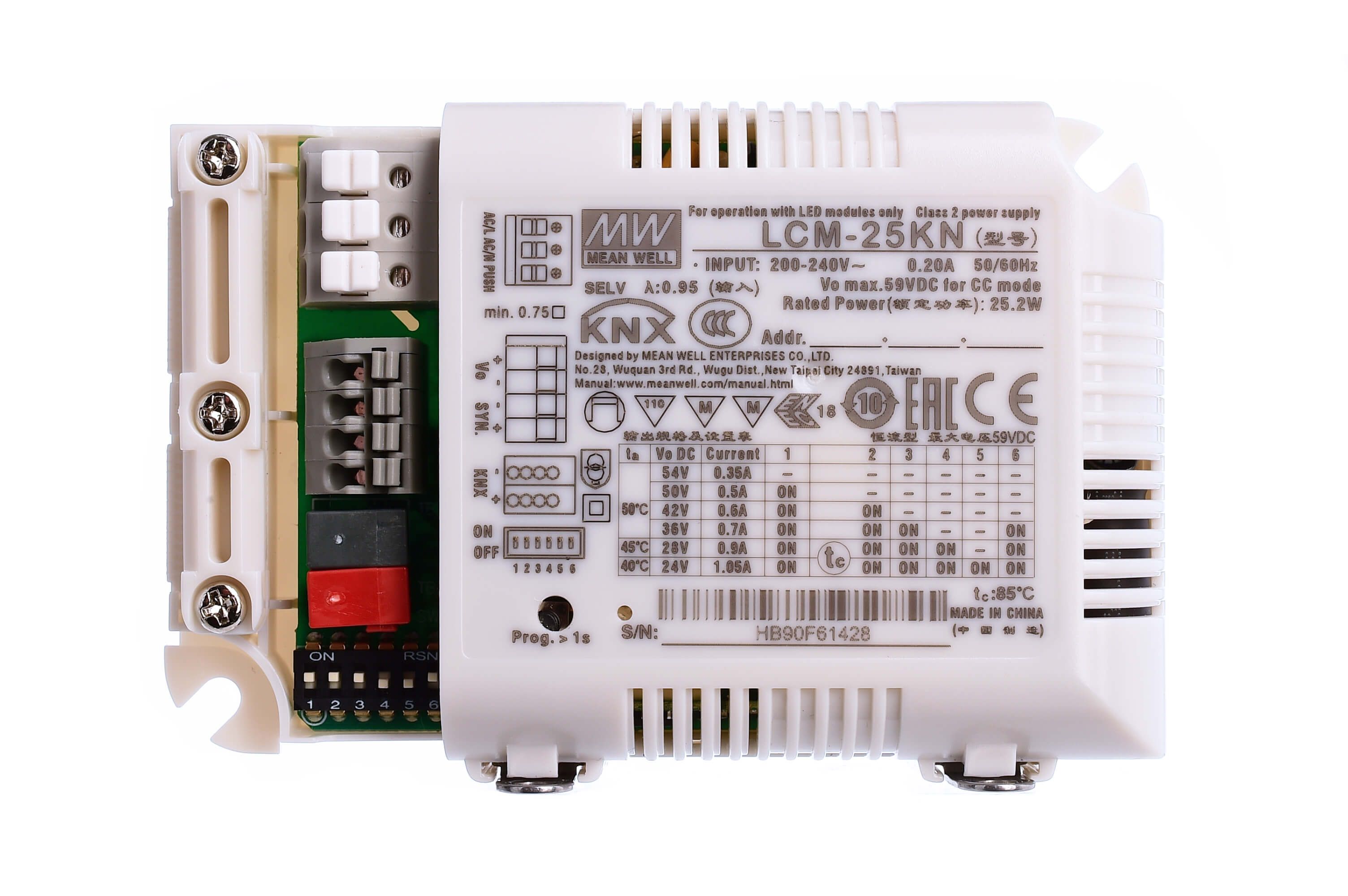 Meanwell, Netzgerät (CC, DC) dimmbar, DIM, Multi CC, LCM-25KN - KNX, Stromkonstant, Dimmbar: Ja, KNX, 2,1-25,2 W, Eingangsspannung: 180-277 V/AC, Bemessungsstrom: 0.17 mA, Ausgangsspannung: 6-54 V/DC, IP 20