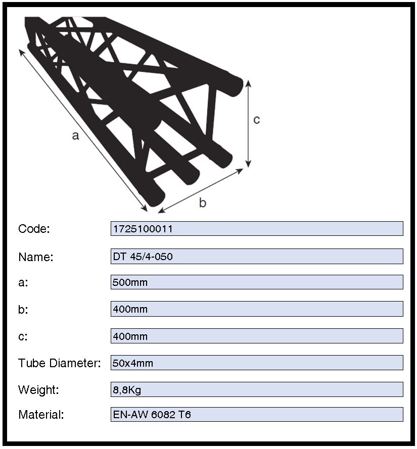 Das DURATRUSS DT45/4 System stammt aus dem 4-Punkt Traversensystem, das mit vier konischen Verbindern, Bolzen und Splint verbunden wird, und enthält jetzt 5 Tubes. Das zusätzliche Rohr bietet einen Mehrwert um Zubehörteile, wie LED Screens, in einer ausgeglichenen, mittigen, Position zu befestigen.