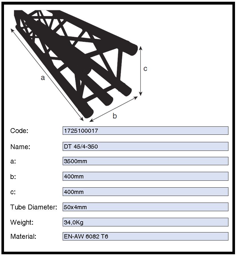 Das DURATRUSS DT45/4 System stammt aus dem 4-Punkt Traversensystem, das mit vier konischen Verbindern, Bolzen und Splint verbunden wird, und enthält jetzt 5 Tubes. Das zusätzliche Rohr bietet einen Mehrwert um Zubehörteile, wie LED Screens, in einer ausgeglichenen, mittigen, Position zu befestigen.