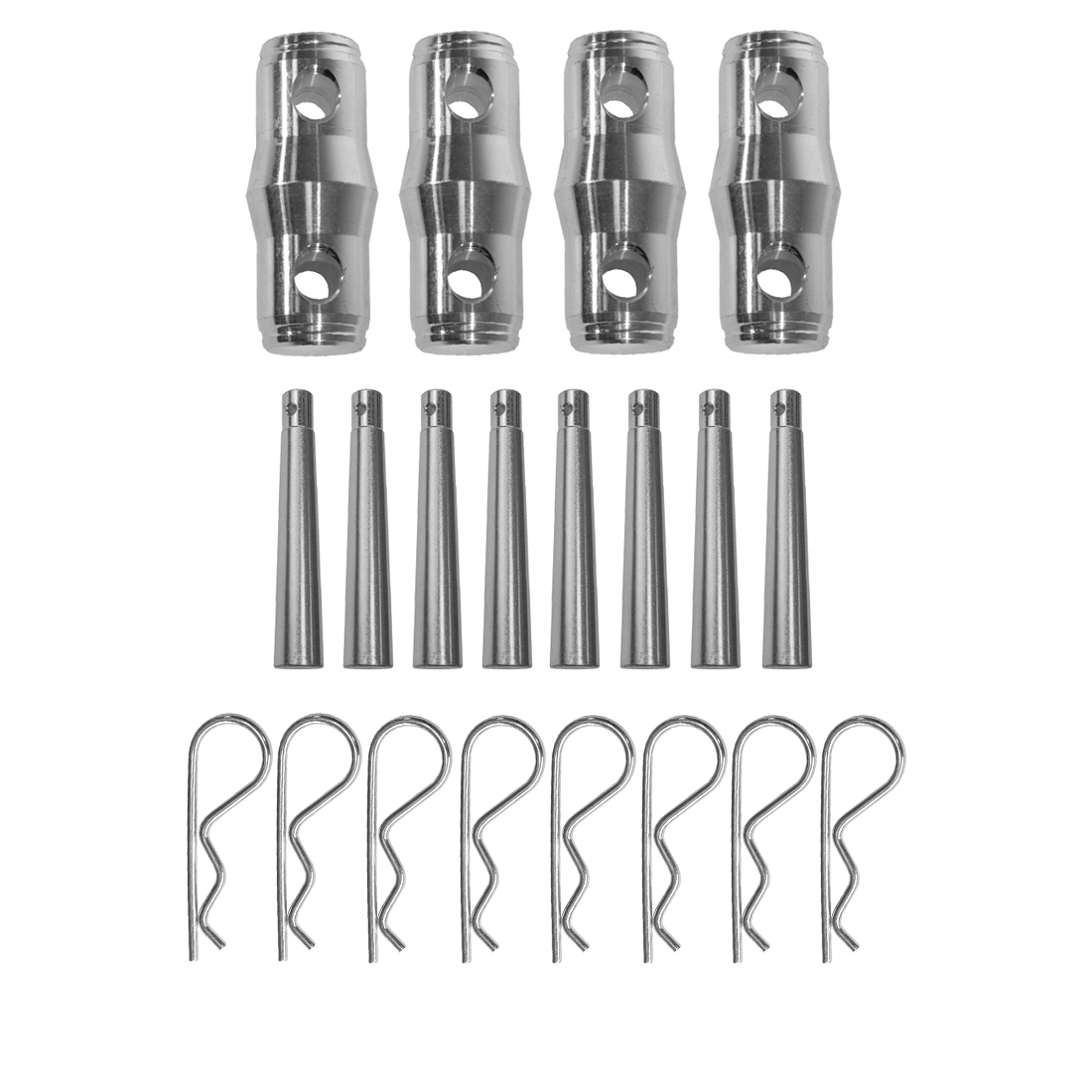 Lieferung inklusiver Verbinderset, bestehend aus 4 konischen Verbindern, 8 Bolzen und 8 Sicherungssplinten.