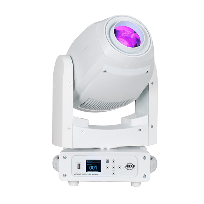 The Focus Spot 4Z Pearl has Locking Power In and out connectors to daisy chain the power, as well as Locking 3-pin DMX In/Out to transmit a DMX signal from one fixture to the next. There is a USB firmware update port built-in plus advanced control options such as: 16-bit fine pan and tilt, multiple DMX control modes, and 6 different dimming options. The Focus Spot 4Z Pearl offers a robust light output in a light weight, compact foot print (18-inch high and one 23 pounds).