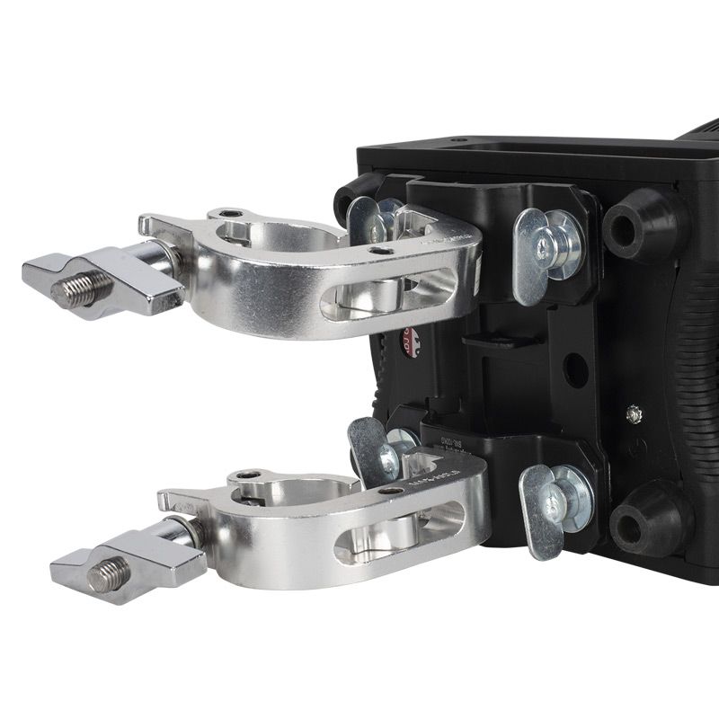 The fixture comes standard with IP65 locking power In/Out connections, locking 3-pin & 5-pin DMX In/Out sockets, color LCD menu display with 6 button control panel, multiple unit power linking, a multi-voltage universal auto switching power supply (AC100-240V), USB port to conveniently update firmware, and omega brackets with two hanging points.