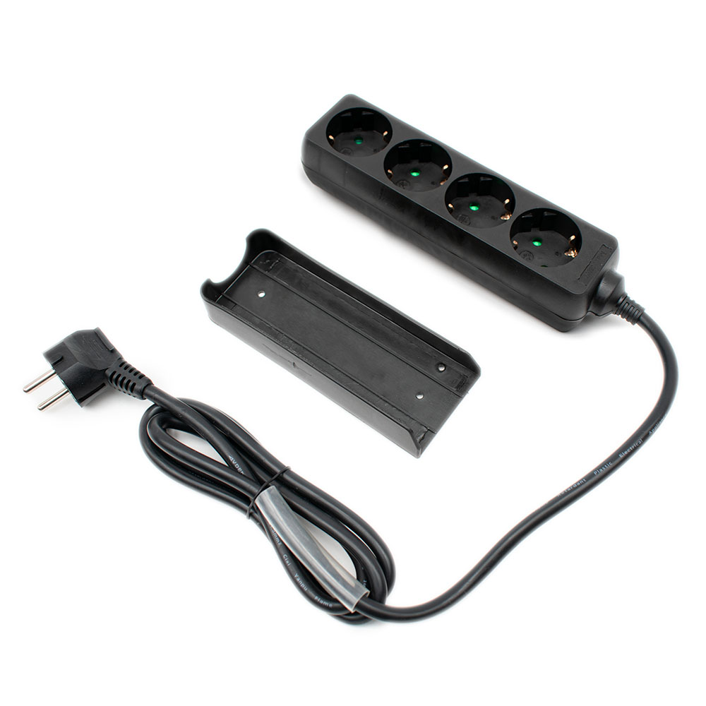 4-fach Schukoleiste mit Montage-Schiene für maximal 3680 Watt. Kabellänge: 1,5 Meter Leitungen: 3x 1,5 mm Inkl. Schrumpfschlauch (7cm)