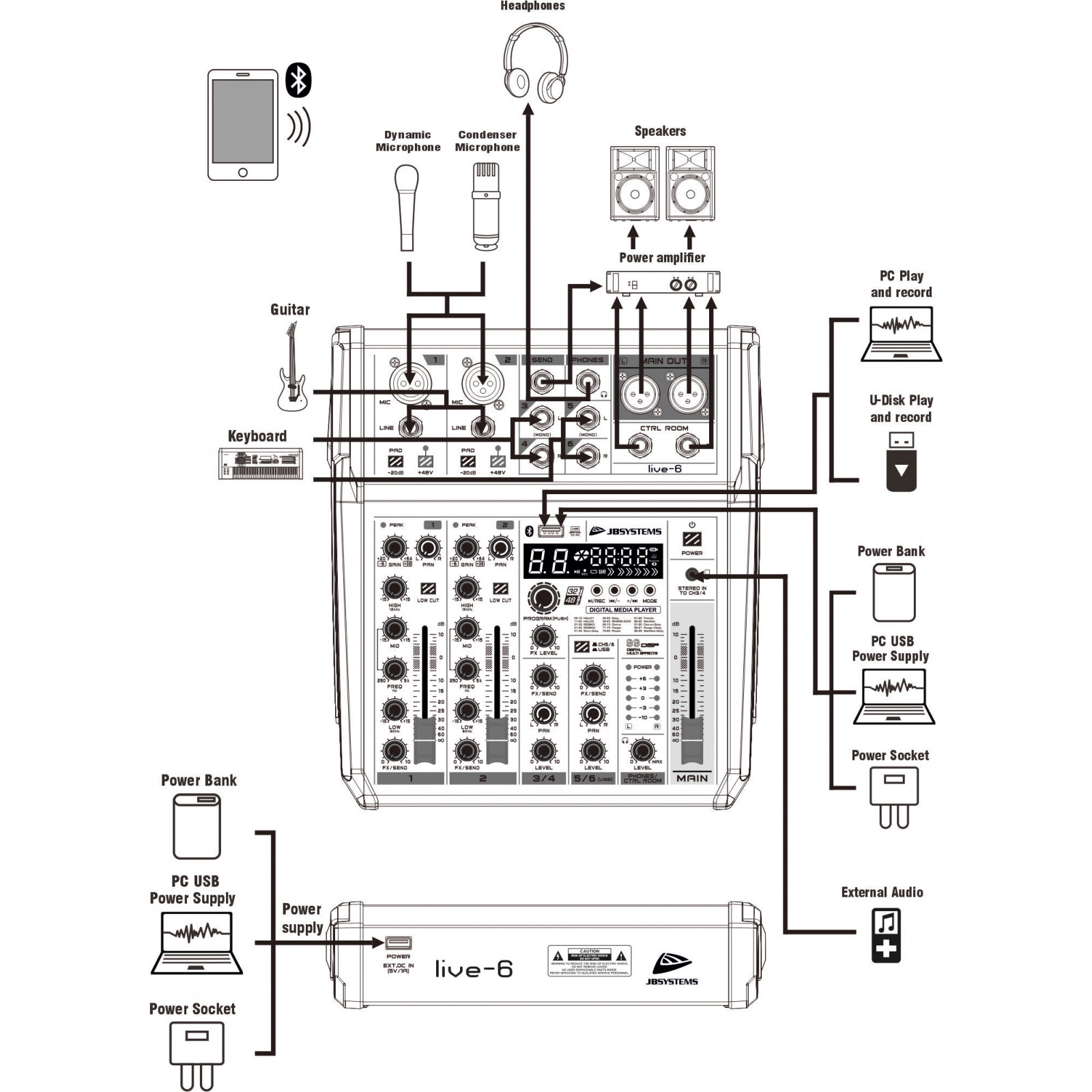 Das LIVE-6 ist ein kompakter und vielseitiger 4-Kanal PA-Mixer von JB Systems.