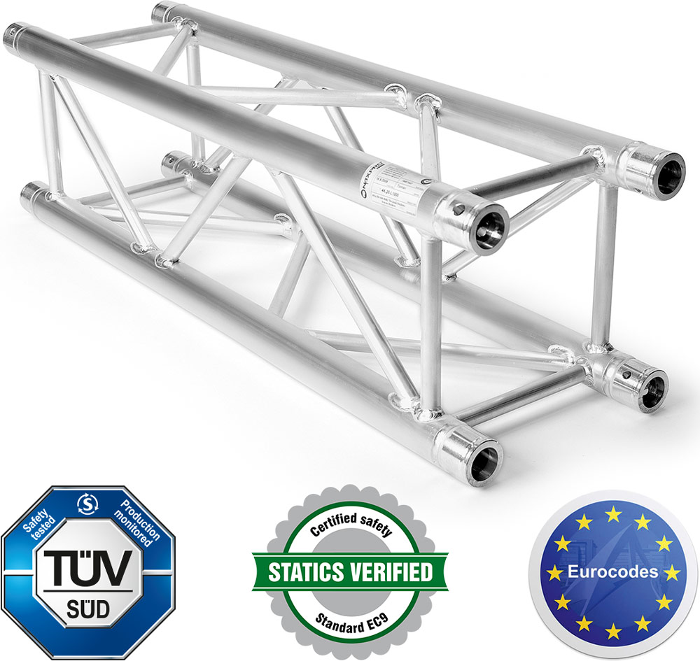 TÜV geprüftes Traversensystem in 4-Punkt Ausführung, besonders gut geeignet für den Messe- und Ladenbau, sowie Veranstaltungstechnik und als Tragsystem für Beleuchtungstechnik. Durch kompakte Bauform kombiniert mit hoher Belastbarkeit ist dieses System für den einfachen Messestand bis hin zum komplexen Rigg-Konstrukt bestens geeignet.