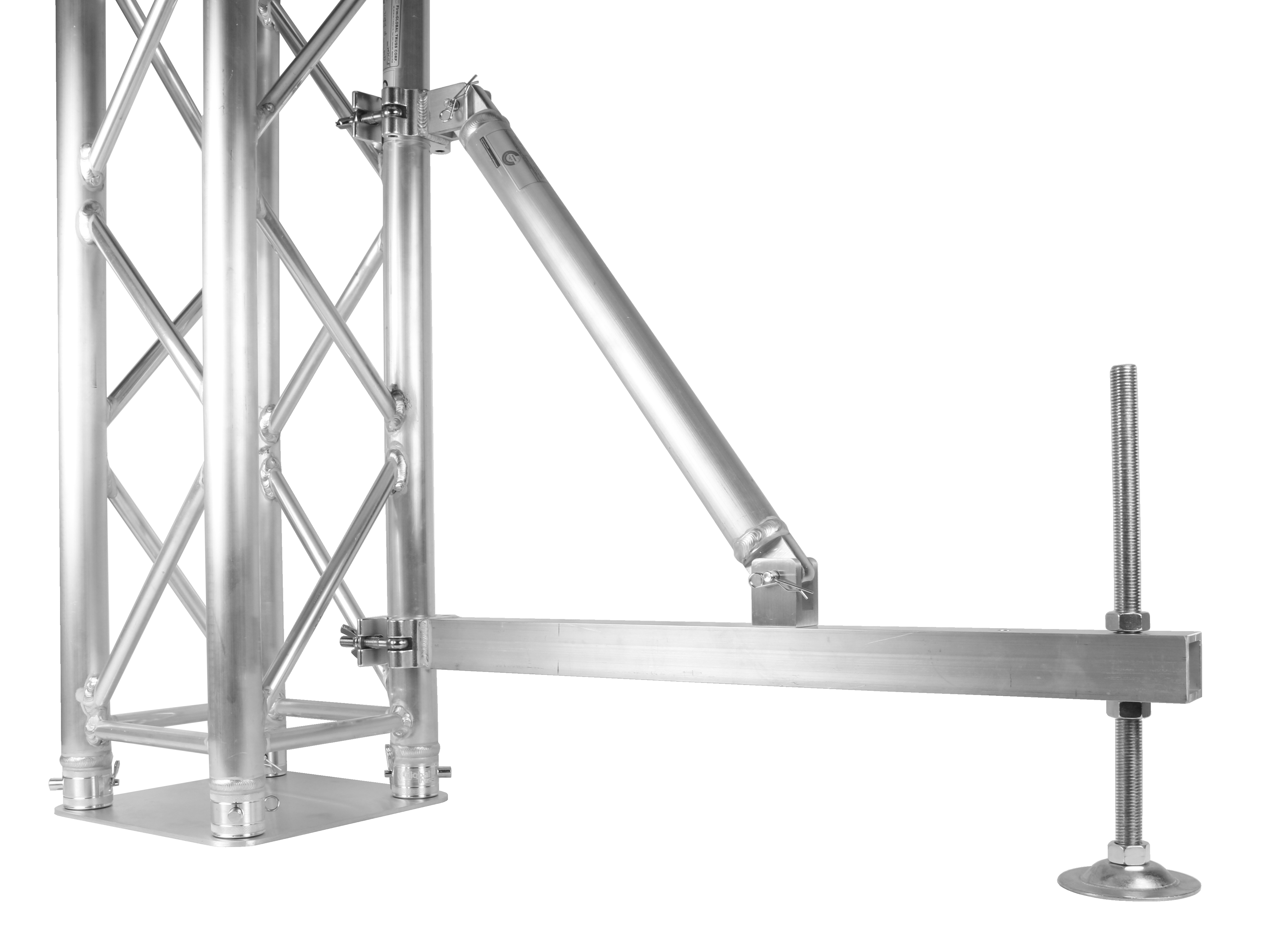 Der Global Truss Outrigger EASY 75cm ist die ideale Lösung, um die Standfläche einer Traversenkonstruktion schnell und unkompliziert auf bis zu 2 m² zu erweitern. Der Outrigger EASY 75cm wird mithilfe von Couplern an einer bestehenden Konstruktion oder einem Tower befestigt. Mit diesem optionalen Ausleger können Konstruktionen auch nachträglich, ohne große Basements und Bodenplatten, kippsicher gemacht werden. Der Ausleger hat eine Länge von 75 cm und kann präzise mit der Spindel ausgerichtet werden. Die Diagonale lässt sich in zwei Löchern des Auslegers fixieren, um eine optimale Verbindung zur Traverse zu gewährleisten.