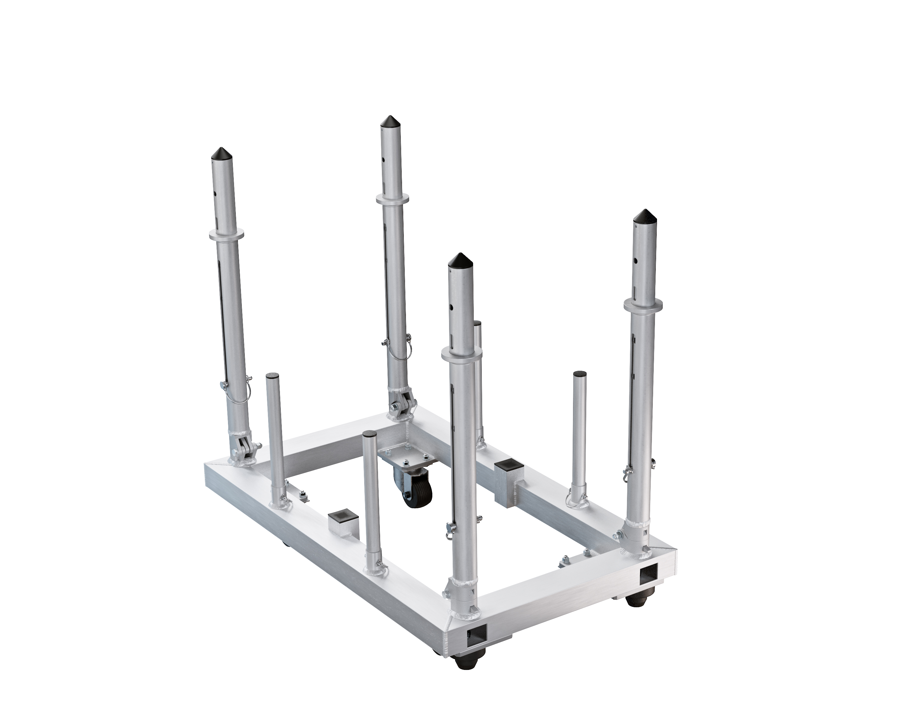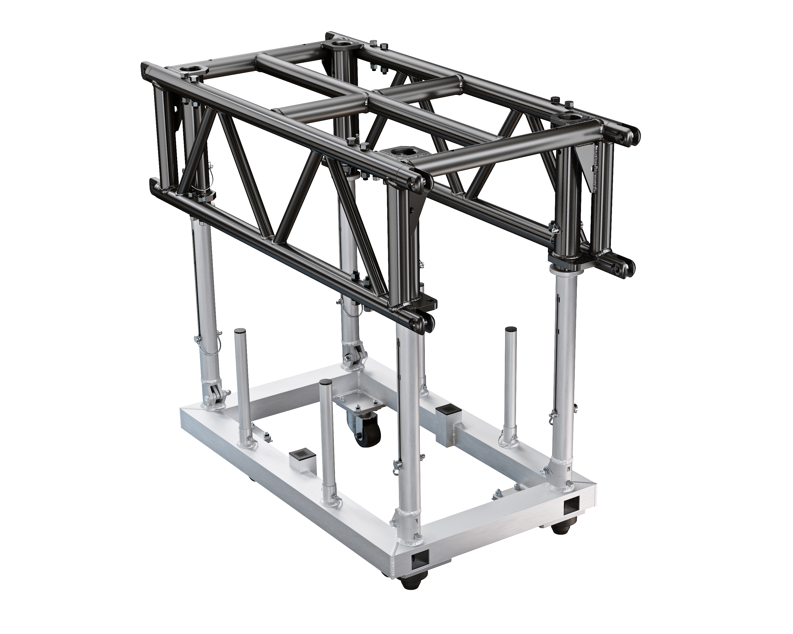 Für einen sicheren und effizienten Transport wird die Traversen mit einem klapp- und stapelbarer Transportwagen (Dolly) geliefert. Der Dolly bietet durch sein durchdachtes Design und seine besonders robuste Bauweise die Grundlage der PreRig Truss. Er lässt sich platzsparend zusammenklappen und stapeln, wodurch auf Tour und im Lager wertvolle Fläche eingespart wird. Die stabilen Stapelstifte lassen sich im Handumdrehen herausnehmen, um beim Einbringen von Geräten in die Traverse von unten mehr Raum zu haben. . Ausgestattet mit leichtgängigen Blickle Rollen (Made in Germany) lässt sich der Dolly mühelos bewegen und auch auf unebenen Untergründen präzise manövrieren. Der Dolly lässt sich in drei Stufen höhenverstellen und ermöglicht dabei zu jeder Zeit einen sicheren Transport. Damit ist der faltbare Dolly für die Global Truss PreRig Truss eine zuverlässige Lösung für effiziente Transport- und Lagerprozesse.