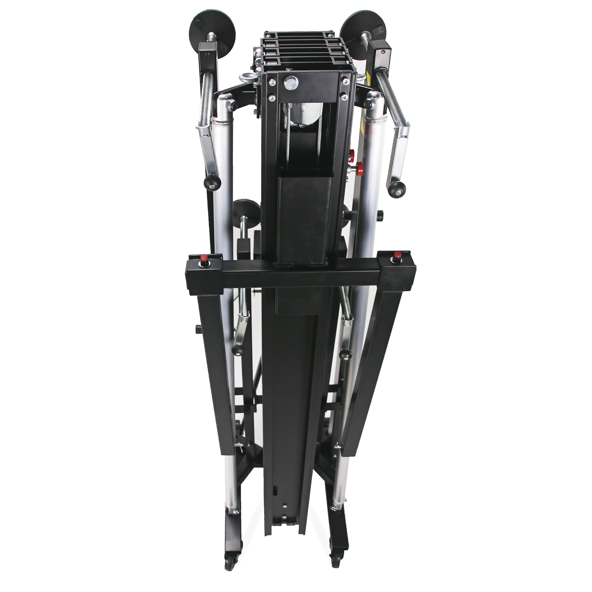 Dieser robuste Lifting Tower mit Frontverladung ist ideal zum Heben von Line-Array-Systemen, Traversen und LED-Bildschirmen. Er kann Lasten von bis zu 350 kg bis zu einer Höhe von 6,5 Metern heben. Da die Lasten direkt vom Boden angehoben werden, wird der Kraftaufwand für den Benutzer auf ein Minimum reduziert. Zu den Sicherheitsmerkmalen gehören ein verstärkter Sockel, eine automatische Fußverriegelung, Sicherheitsstifte und eine Wasserwage, womit der Turm für optimale Stabilität ausgerichtet werden kann.