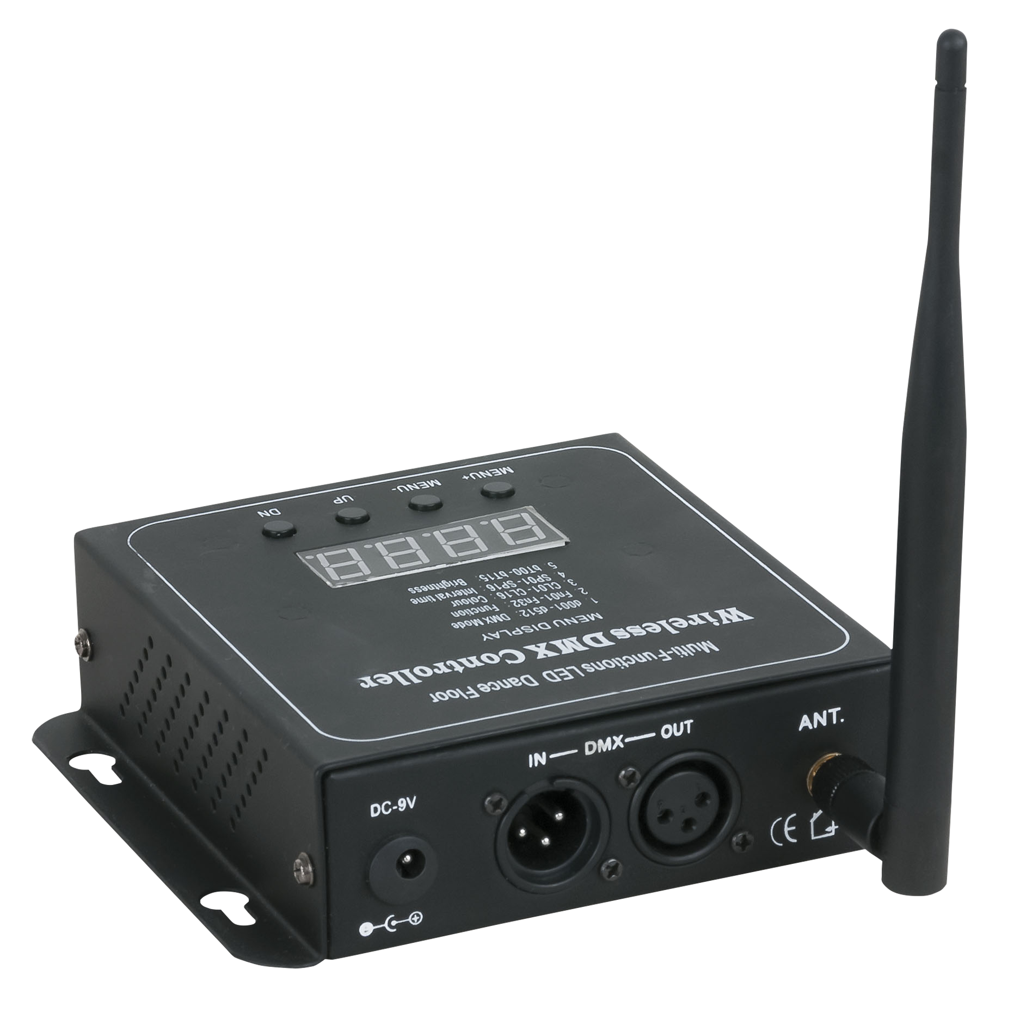 Die Dancefloor Sparkle DMX Box bietet eine intuitive Benutzeroberfläche für die Auswahl von Farben, Programmen, Helligkeit und Geschwindigkeit Ihres Dancefloors per DMX. Die Signale werden per RF an den Dancefloor übertragen, um den Bedarf an Kabeln so gering wie möglich zu halten.