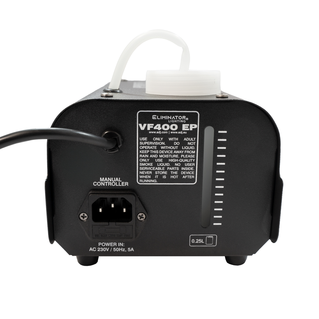 Equipped with a 0.25 liter internal fog fluid tank, the VF 400 EP ensures long-lasting operation. Keep track of your fluid levels effortlessly with the convenient fluid level indicator, allowing you to plan your performances with ease. To provide you with complete control, the machine comes with the ADJ Z-VG400EP-R wired (fixed) remote, ensuring seamless command over your fog effects.