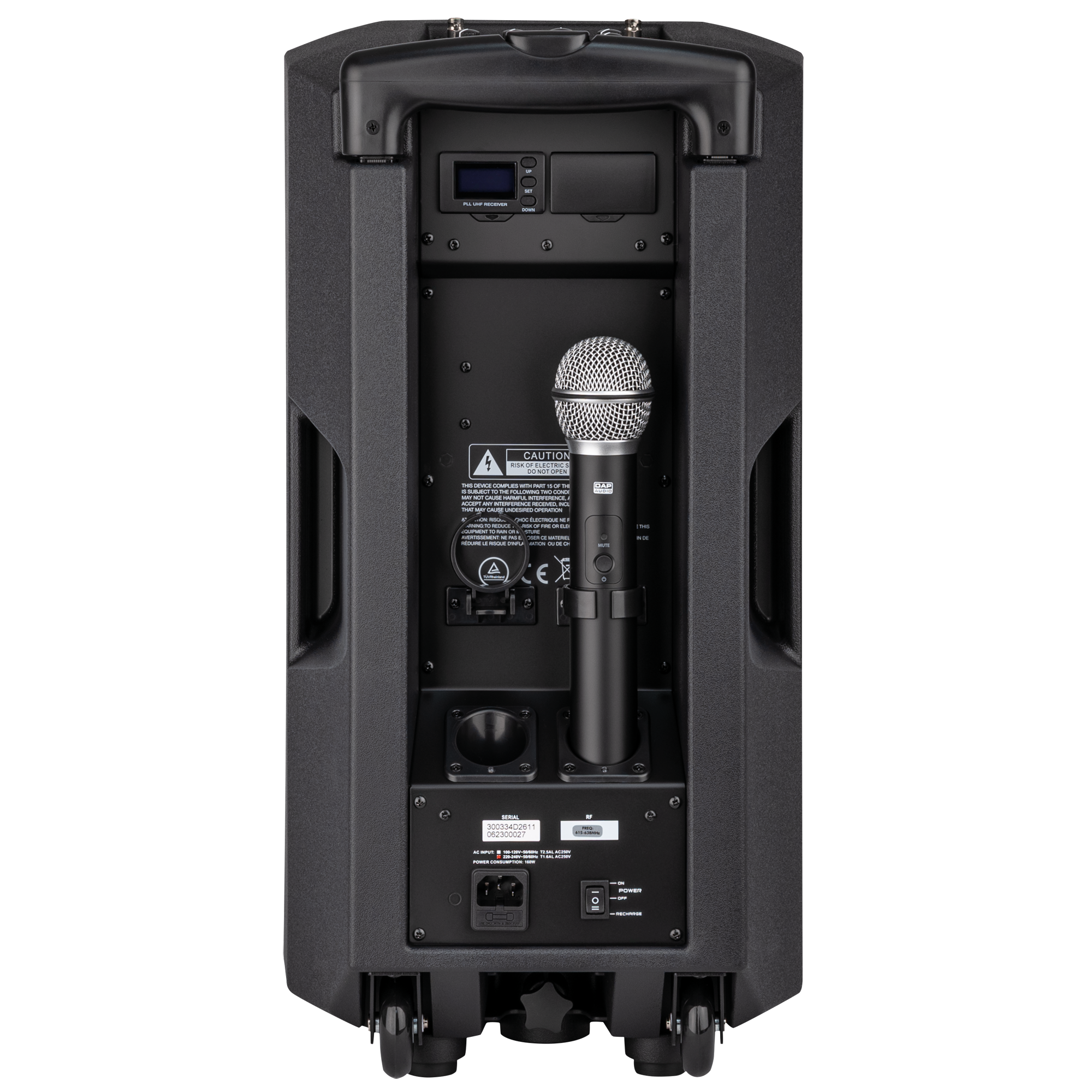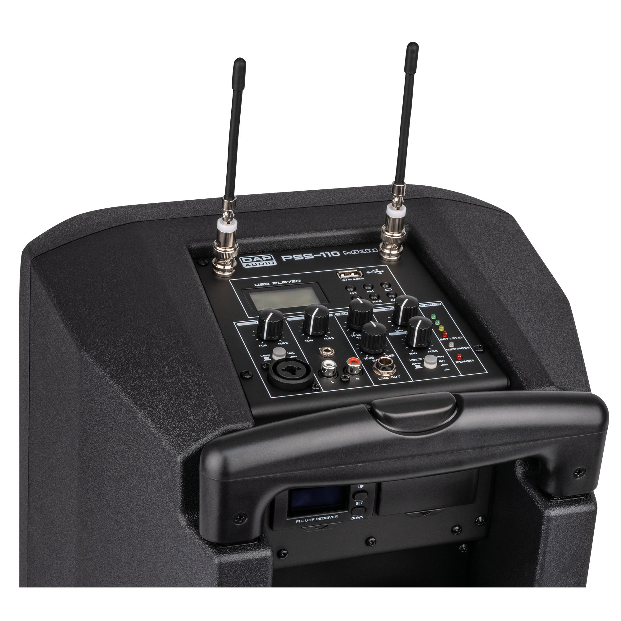 Der Akku des PSS-110 MKIII hält bei voller Leistung mindestens 3 Stunden und lässt sich in 5 Stunden wieder voll aufladen. Der Lautsprecher erzeugt einen Schalldruckpegel von 117 dB SPL in 1 m Entfernung. Für einen Akkulautsprecher ist das eine ordentliche Lautstärke. Der eingebaute Verstärker unterstützt USB, einen Aux-Eingang (3,5 mm Miniklinke/Cinch) und einen Mikrofoneingang (6,3 mm Klinke/XLR). Mikrofon- und Medienlautstärke können einzeln angepasst werden. Außerdem können Sie die EQ-Parameter und die Master-Lautstärke einstellen.