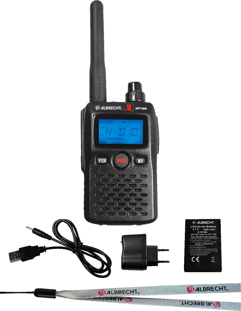 Art: 20-Kanal-Tour-Guide-Sender, Trägerfrequenzbereich: 446,00625-446,1 MHz, Kanäle: 1, Zul. Einsatztemperatur: -10 °C bis +40 °C, Sendeleistung: 10 mW/100 mW, Reichweite: 200 m/2 km, Stromversorgung Sender: 1200-mAh-Li-Ion-Akku, Breite Sender: 83 mm, Höhe Sender: 52 mm, Tiefe Sender: 27 mm, Gewicht Sender: 150 g, Anschlüsse Sender: 4-Pol-Headset-Buchse,