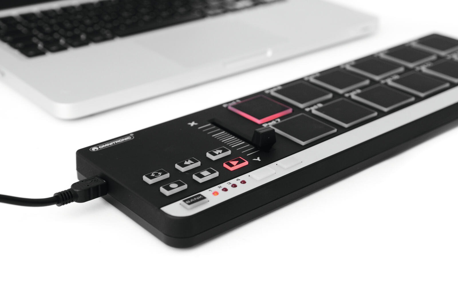 • 12 hintergrundbeleuchtete, anschlagdynamische Drumpads zum Senden von Notendaten, MIDI CC oder Programmwechseln