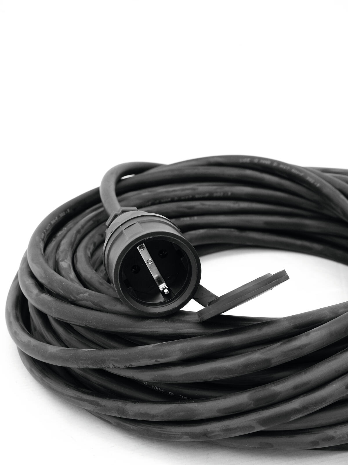 • Schwere Gummischlauchleitung mit anmontiertem Schutzkontakt-Gummistecker und -kupplung