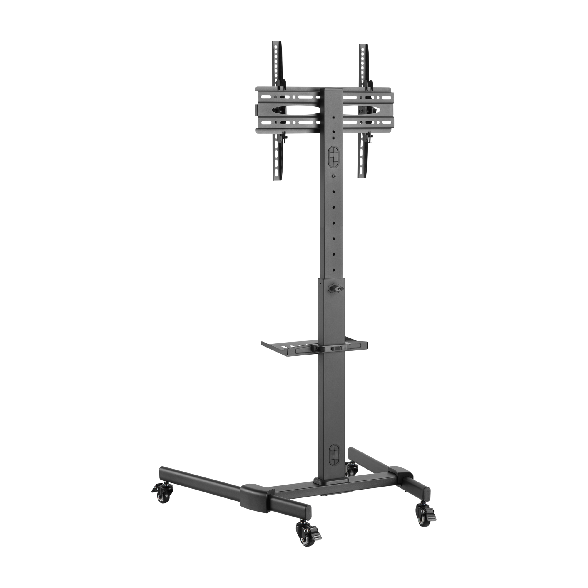 Der Showgear Flatscreen Trolley 7 - 32" bis 55" ist ein handlicher und kompletter Monitorwtrolley aus Stahl, der für alle 32 bis 55 Zoll großen Flachbildschirme mit Mediaplayer geeignet ist. Dieser robuste Flachbildschirmtrolley ist sehr flexibel einsetzbar. Er hat zum Beispiel Schwenkräder, die mit einem Schnellbremssystem ausgestattet sind. Außerdem können Sie Ihren Bildschirm um bis zu 10° nach oben und unten neigen. Schließlich ist die Höhe des Bildschirms von 116 bis 151 cm einstellbar, ohne dass die Stabilität (Mitte des Bildschirms) verloren geht. Natürlich können Sie die Höhe des Bildschirms dank des Schnellverschlusses mühelos verstellen.