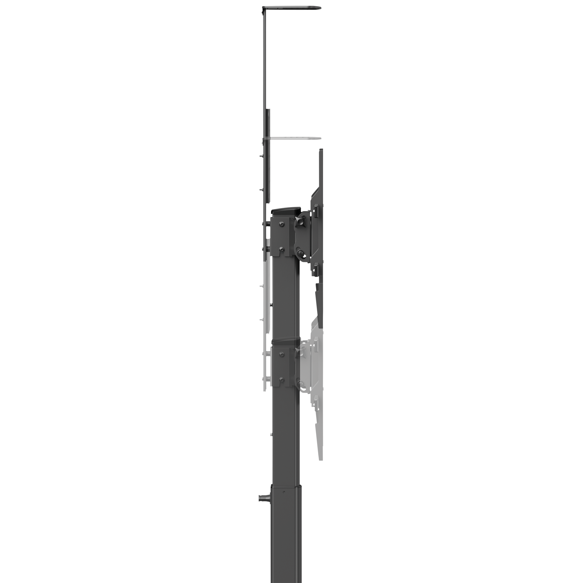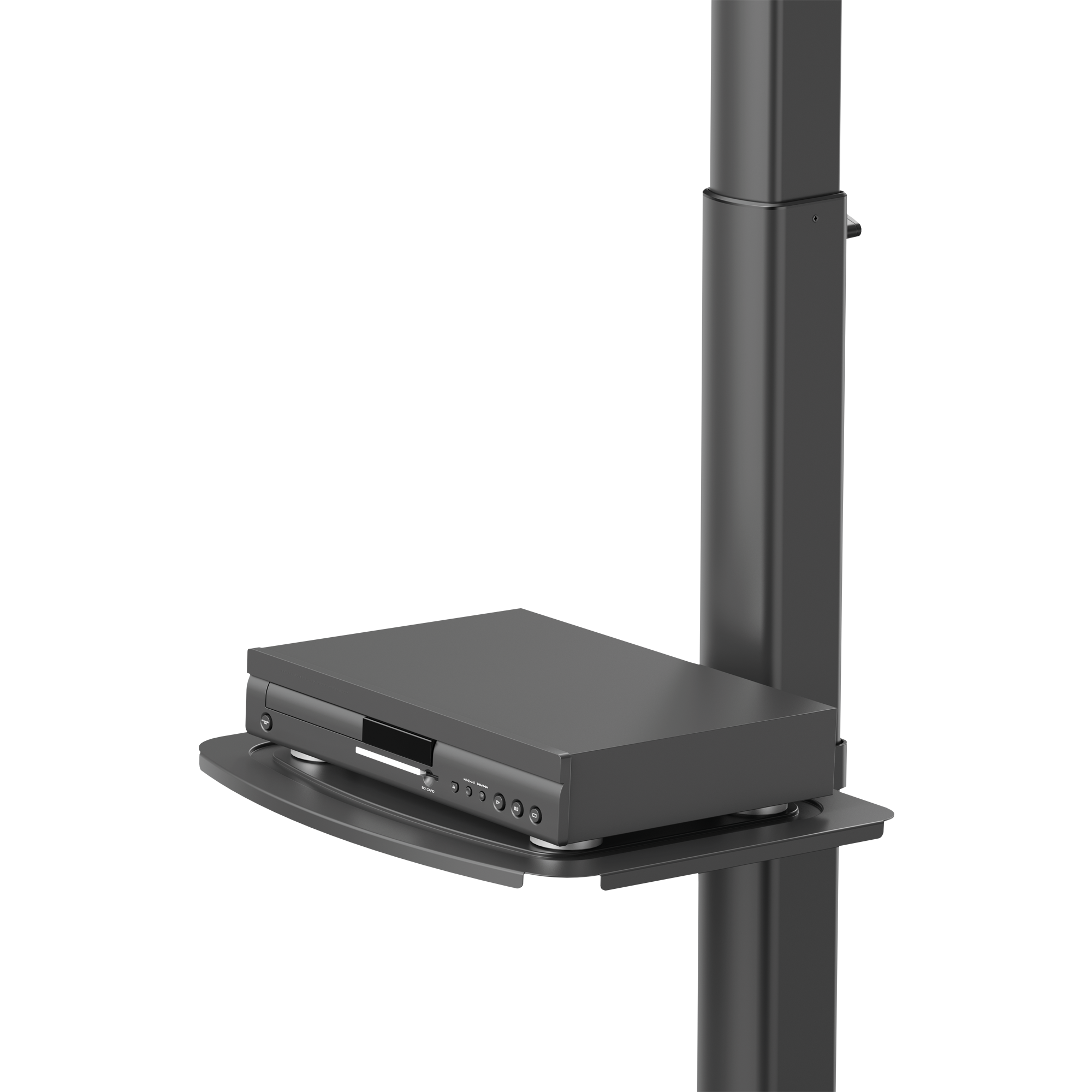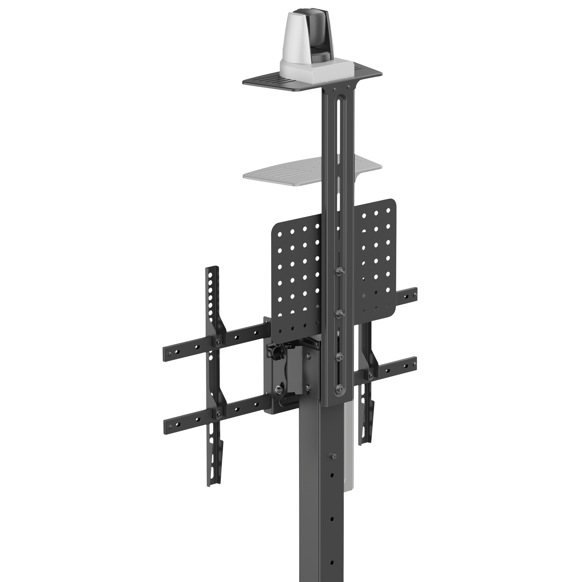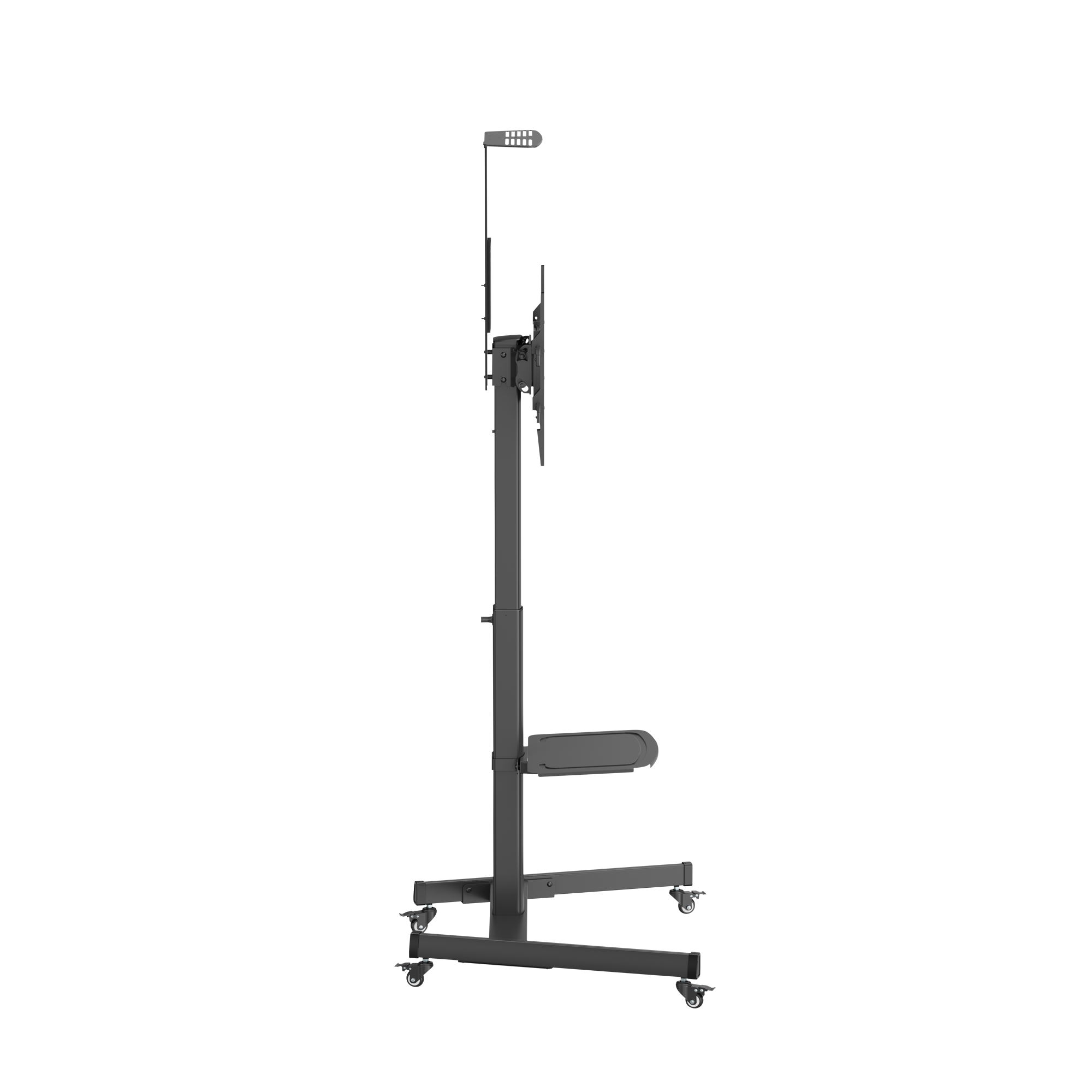 Er verfügt über eine Schnellverriegelung für eine reibungslose Höhenverstellung und eine werkzeuglose Neigungsfunktion (+5° bis -12°) für optimalen Sehkomfort. Der Wagen kann sowohl im Hoch- als auch im Querformat eingesetzt werden und verfügt über höhenverstellbare Ablagen für AV-Geräte und Kameras. Hochbelastbare, feststellbare Rollen sorgen für einfache Mobilität und Stabilität, während das integrierte Kabelmanagement für Ordnung sorgt.