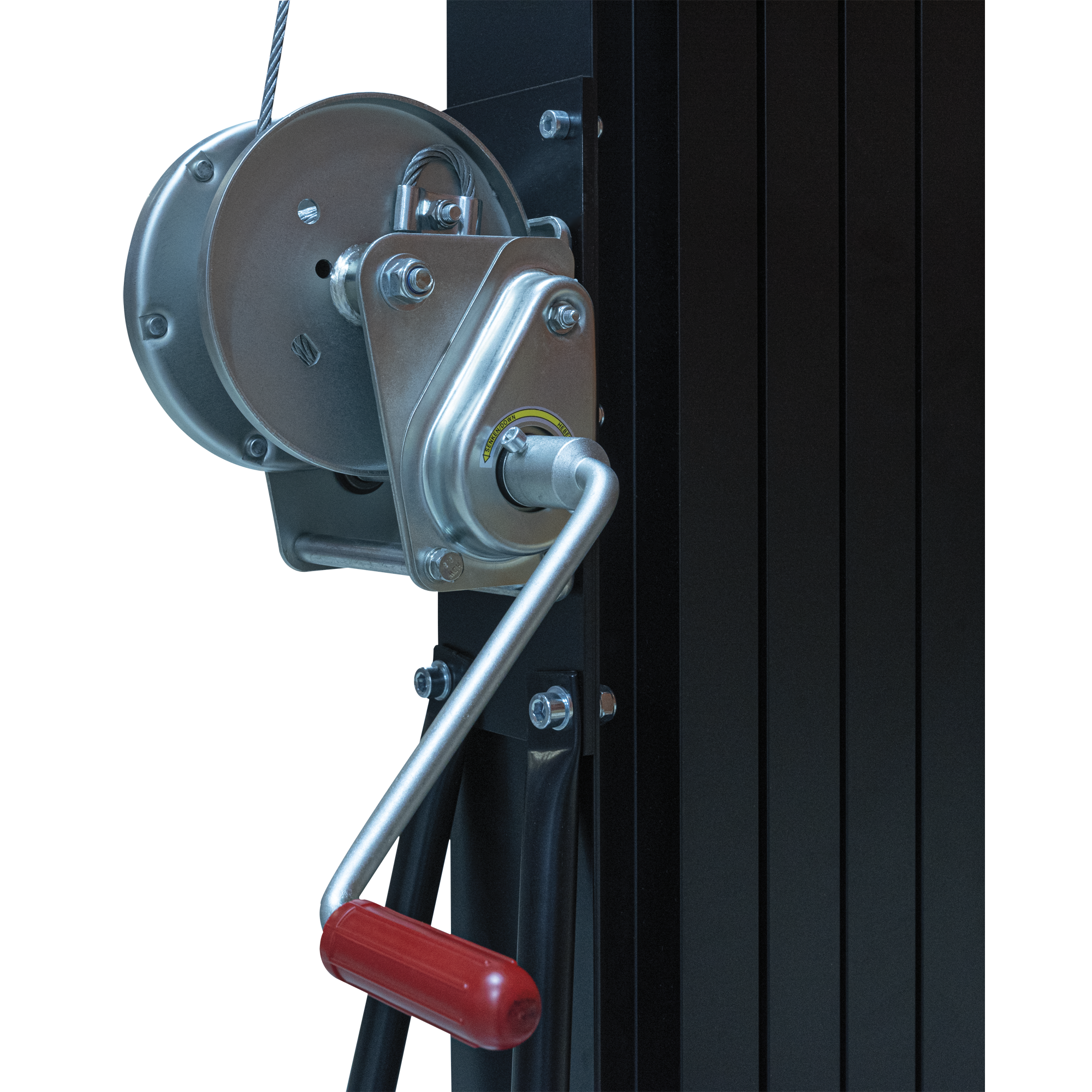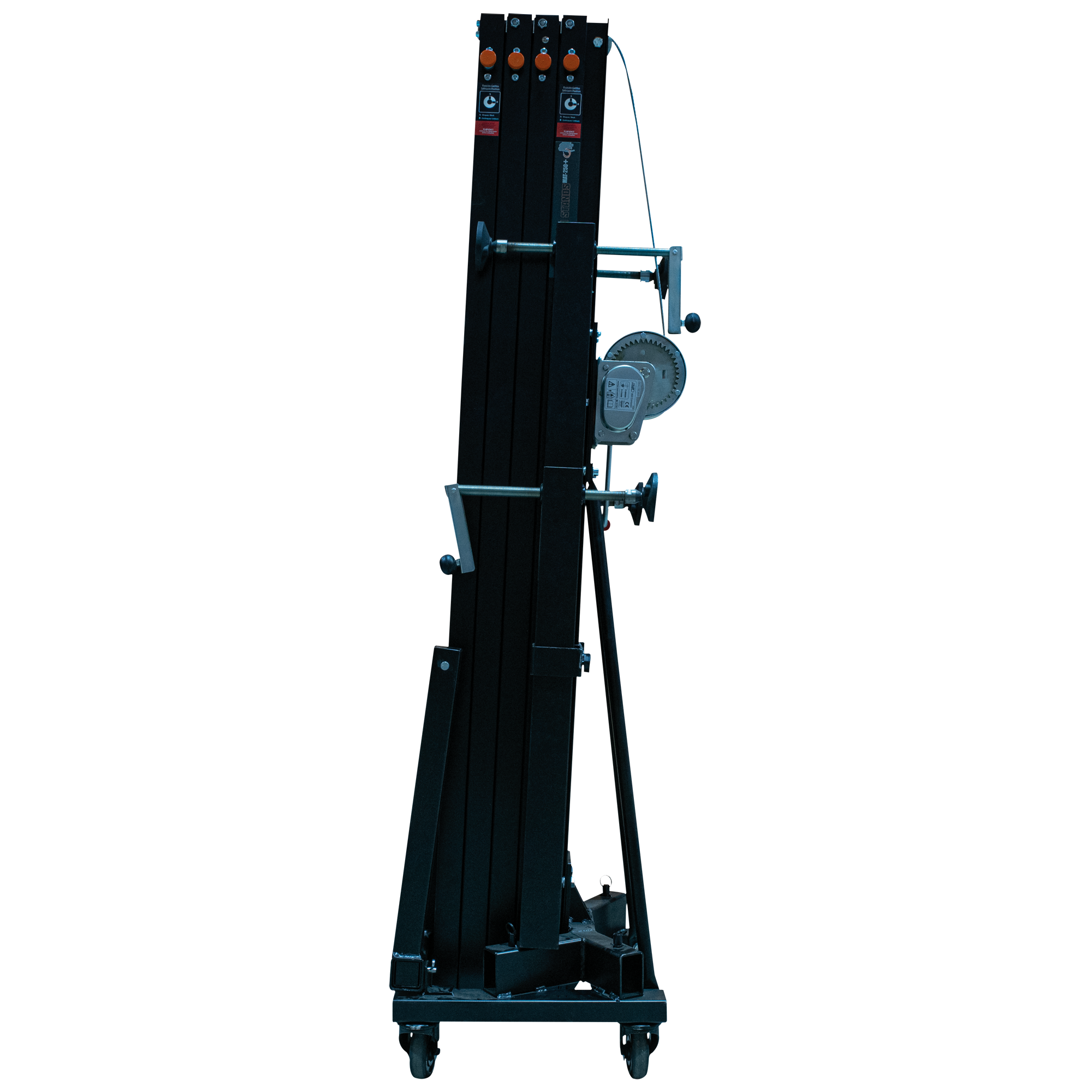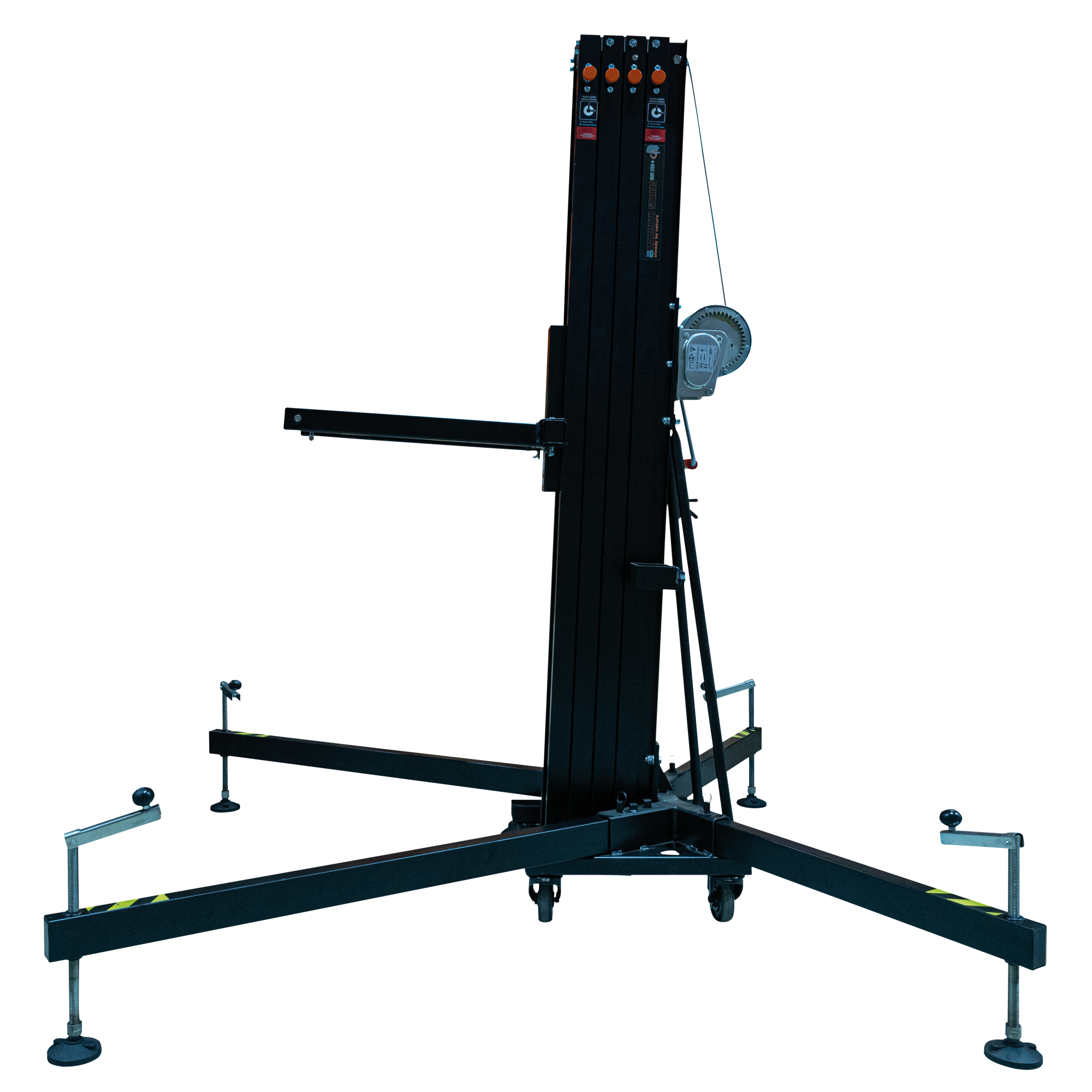 Dieser kompakte Lifting Tower mit Frontverladung ist ideal zum Heben von Line-Array-Systemen, Traversen und LED-Bildschirmen. Dank seiner kompakten Maße passt er auch in kleinere Lieferwagen und ist leichter zu transportieren. Außerdem ermöglicht er dadurch einen ergonomischeren Aufbau Ihrer Anlage. Trotz seiner bescheidenen Größe kann er Lasten von bis zu 250 kg auf eine Höhe von 6,5 Metern heben. Da die Lasten direkt vom Boden angehoben werden, wird der Kraftaufwand für den Benutzer auf ein Minimum reduziert. Zu den Sicherheitsmerkmalen gehören ein verstärkter Sockel, eine automatische Fußverriegelung, Sicherheitsstifte und eine Wasserwage, womit der Turm für optimale Stabilität ausgerichtet werden kann.
