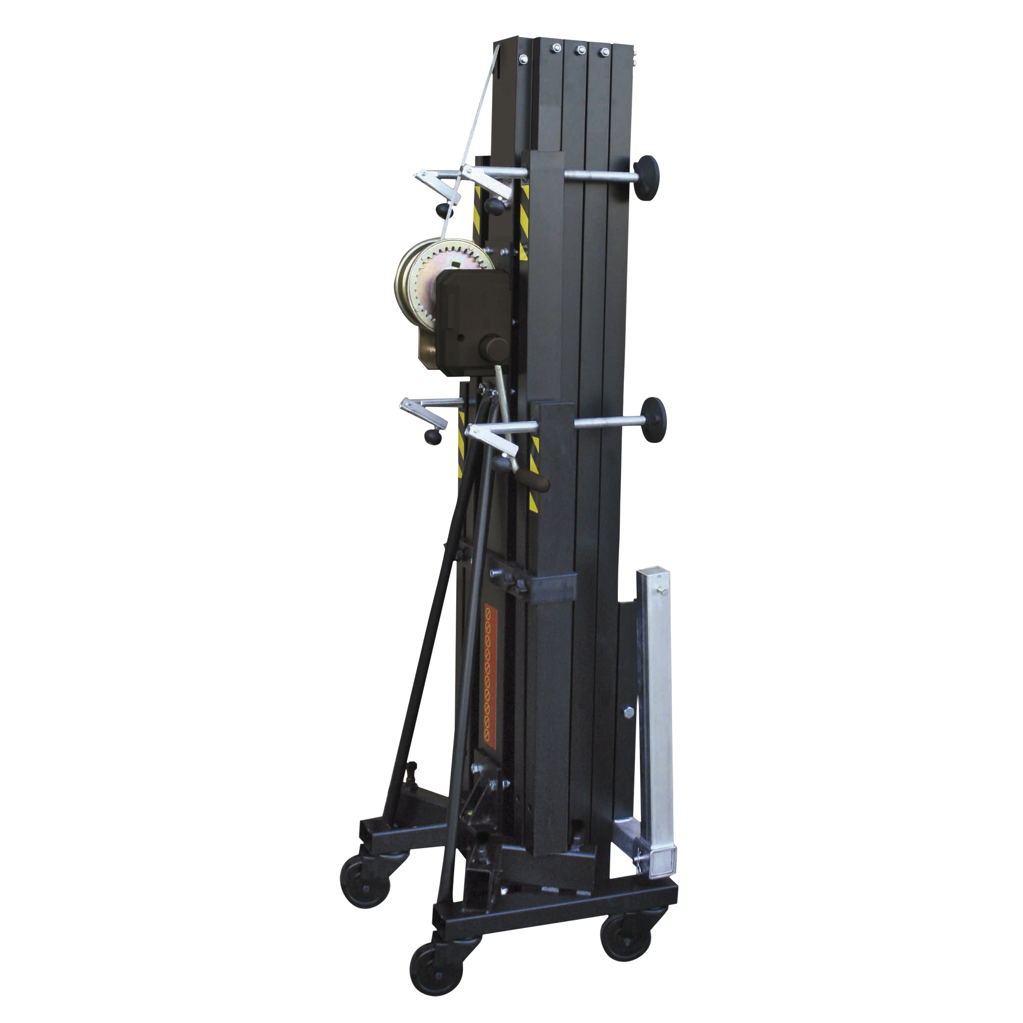 Dieser Lifting Tower mit Frontverladung ist ideal zum Heben von Line-Array-Systemen, Traversen und LED-Bildschirmen. Er kann Lasten von bis zu 250 kg bis zu einer Höhe von 5,4 Metern heben. Da die Lasten direkt vom Boden angehoben werden, wird der Kraftaufwand für den Benutzer auf ein Minimum reduziert. Zu den Sicherheitsmerkmalen gehören ein verstärkter Sockel, eine automatische Fußverriegelung, Sicherheitsstifte und eine Wasserwaage, womit der Turm für optimale Stabilität ausgerichtet werden kann.