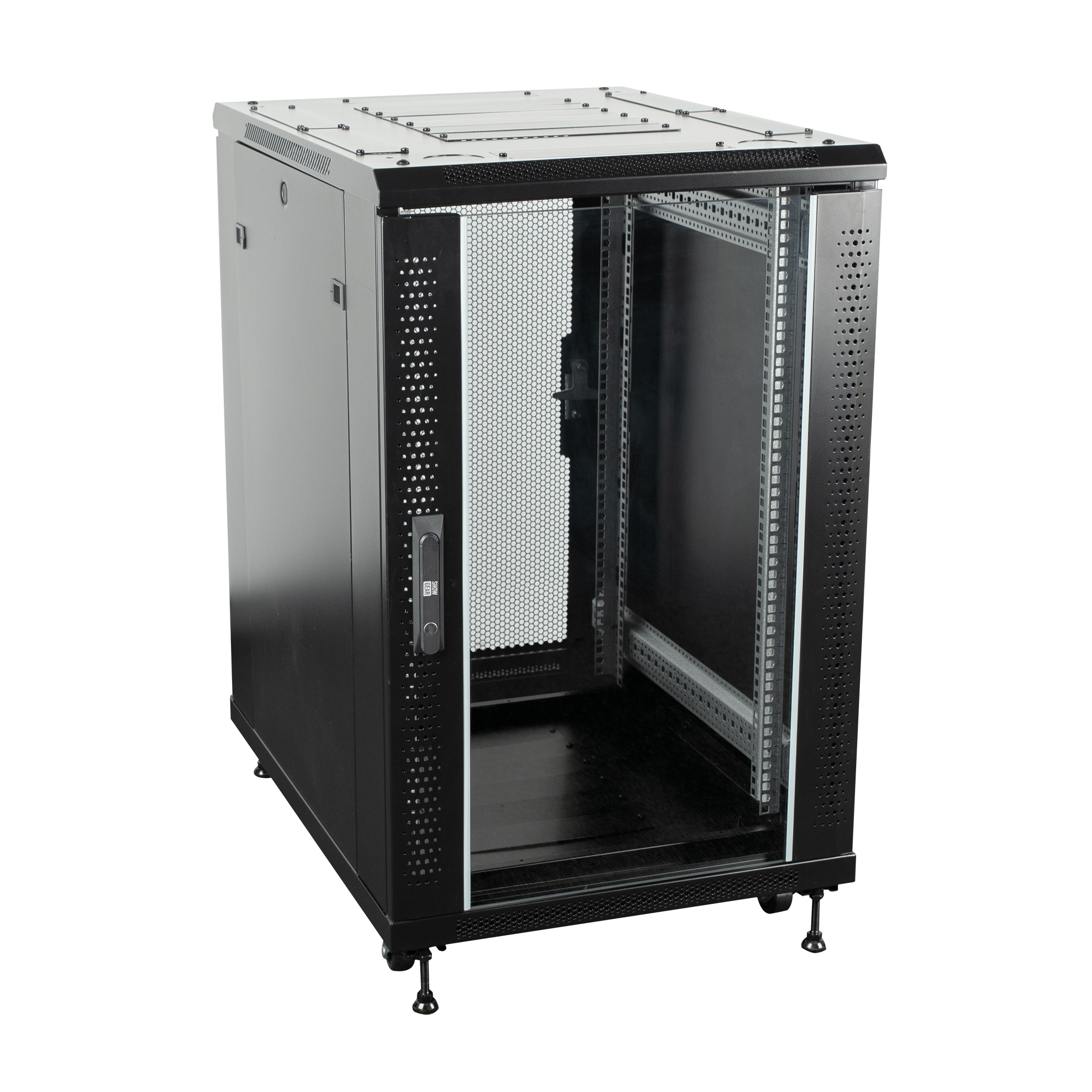 Der Showgear RCA-FSG-18 ist ein abschließbarer 19"Netzwerkschrank mit einer Höhe von 18 Rackeinheiten (988 mm). Er ist sowohl mit Schwenkrädern als auch mit Gummifüßen ausgestattet. Sie können zwischen beiden Optionen wählen, so dass er sowohl für mobile als auch für feste Anwendungen geeignet ist. Er kann an jeder Seite geöffnet werden, da er über zwei abnehmbare Seitenwände, eine Gittertür an der Rückseite und eine Glastür an der Vorderseite des Geräts verfügt. Das macht es einfach, 19-Zoll Rackware zu installieren und zu aktualisieren.