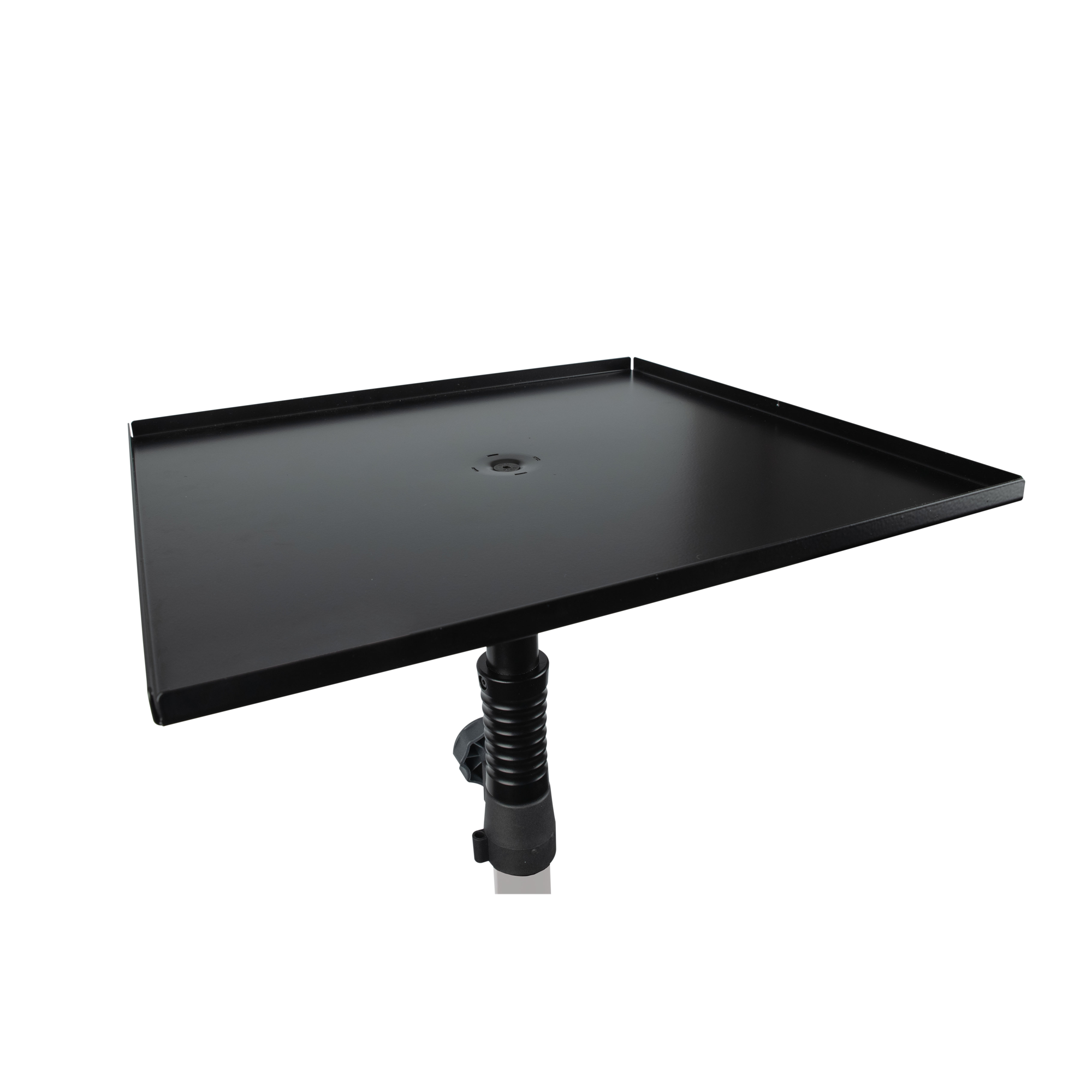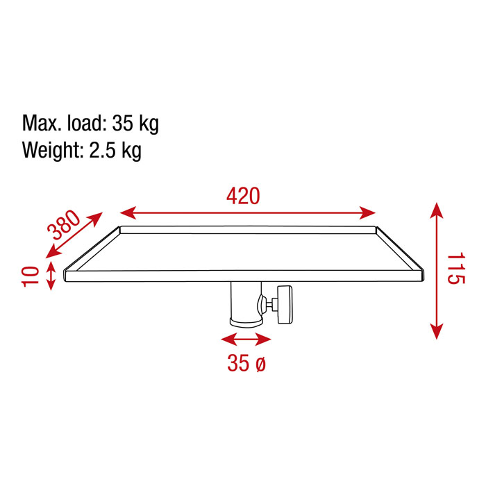Die stabile Showgear Ablage für 35-mm-Ständer besteht vollständig aus Metall und passt perfekt auf ein 35-mm-Rohr. Sie können damit einen normalen Lautsprecherständer mit einer flachen, horizontalen Ablage von 42x38 cm versehen, die ideal ist für einen Laptop, Monitorlautsprecher, einen Beamer oder andere Geräte bis zu 30 kg. Die Kanten sind nach oben zu einem 10 mm hohen Rand gebogen, der der Ablage Stabilität verleiht und verhindert, dass Gegenstände herunterrutschen.