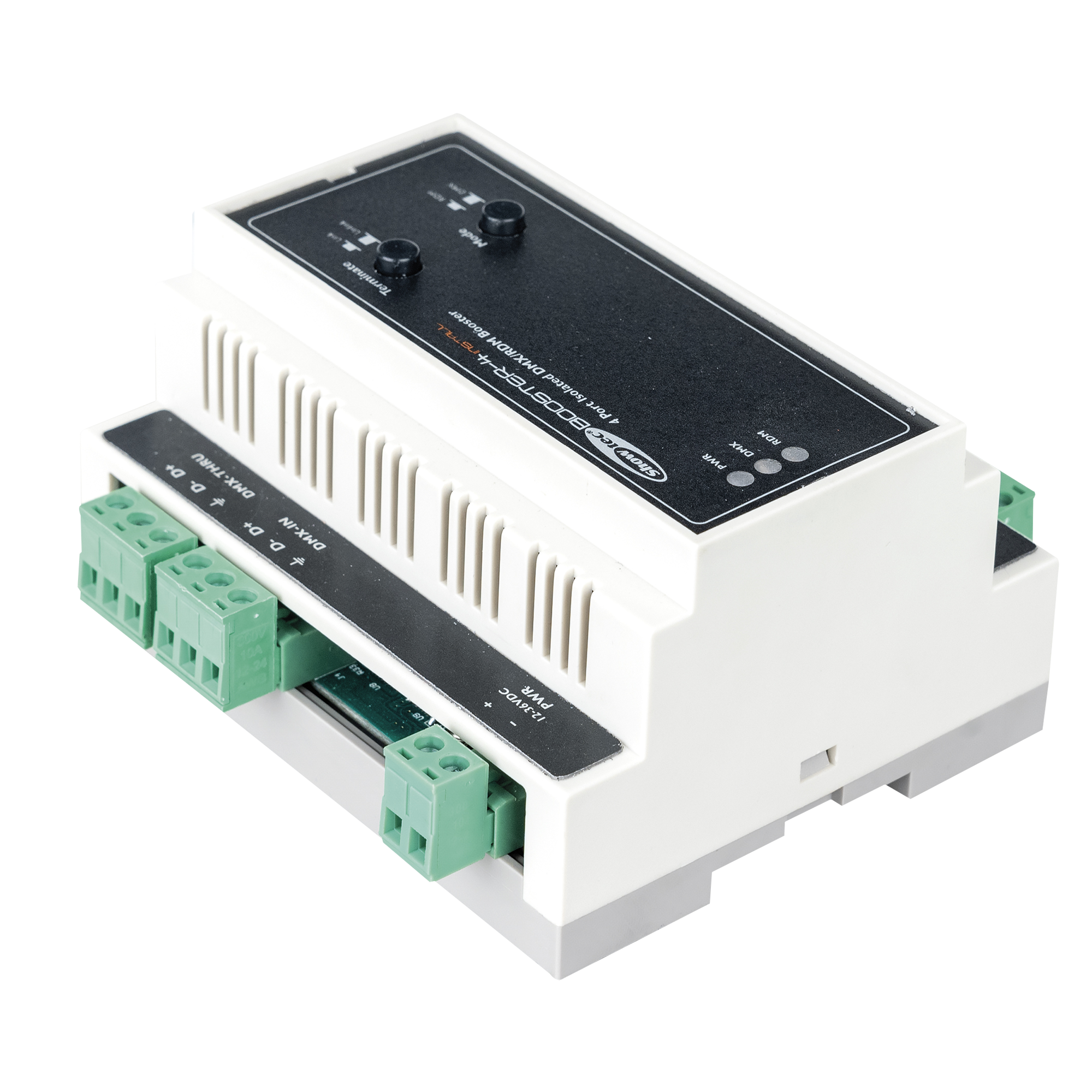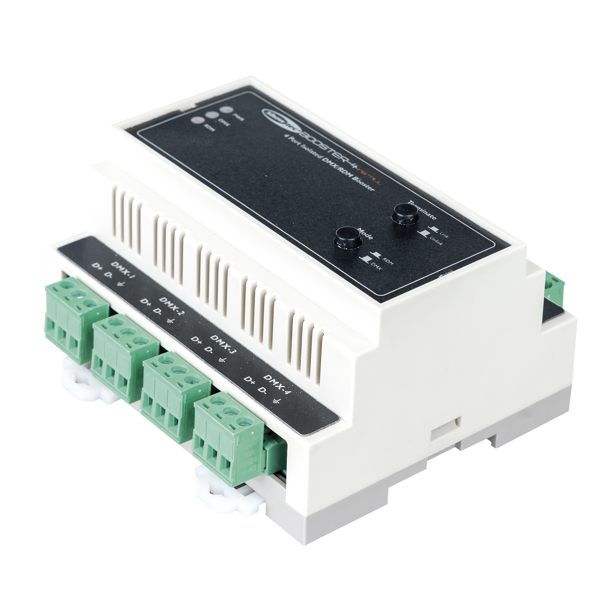 Der Showtec Booster-4 Install ist der ideale kompakte Festinstallations-Booster für Sie. Alle Anschlüsse lassen sich einfach mit den steckbaren Phoenix-Klemmen verbinden, und beide Eingänge sind optisch isoliert, um zu verhindern, dass Störungen auf Ihr Signal gelangen. Der auf einer DIN-Schiene montierte Booster verteilt sowohl DMX als auch RDM und ist ideal für Projekte zur Integration von Netzwerksystemen.