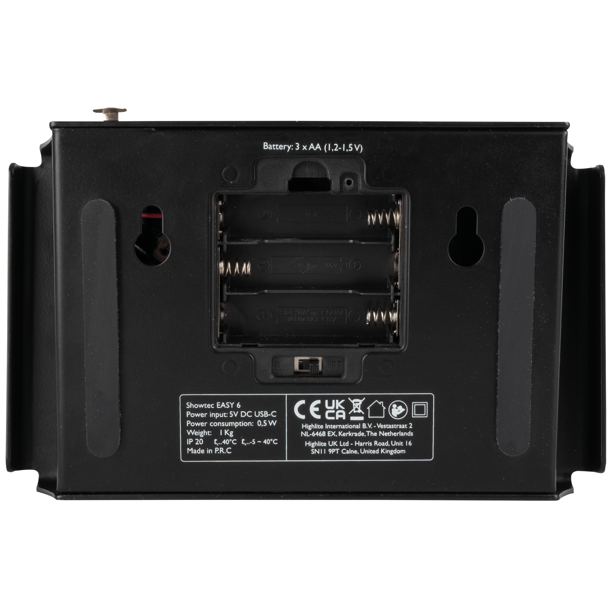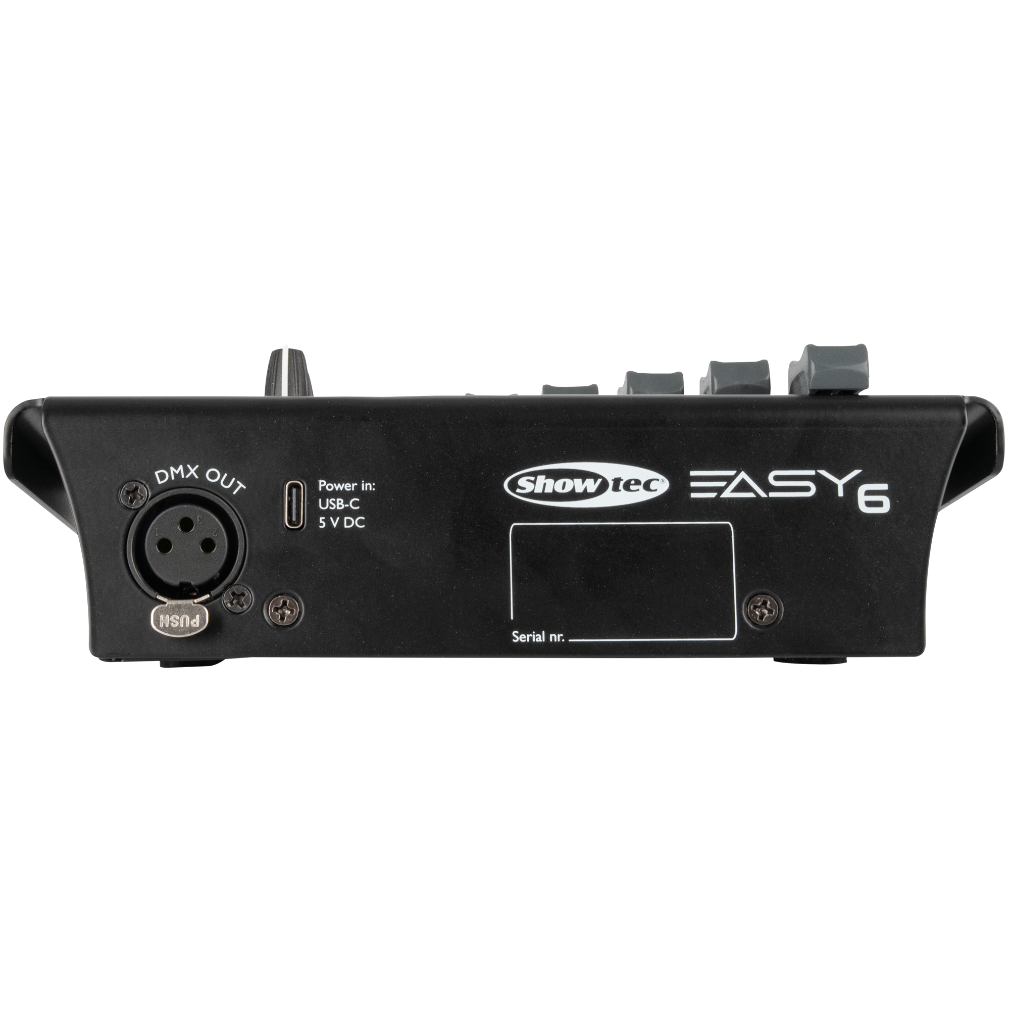 Der Showtec Easy 6 ist ein kompakter 6-Kanal-DMX-Controller mit 6 Fadern, 6 Tasten mit integrierten LEDs, einer Modus-Taste, einem Fade-Drehknopf und einem Master-Dimmer-Knopf. Er eignet sich ideal für Situationen mit einfachen Licht-Setups wie Ausstellungen oder kleine Geschäfte oder für Bühnencrews zum Testen von DMX-Equipment. Mit den integrierten Griffen und den 2 Befestigungsschlitzen kann der Easy 6 auf verschiedenste Weise verwendet werden. Auf jeder der Tasten können Szenen gespeichert werden und die integrierten LEDs zeigen an, ob eine Wiedergabeszene auf einer Taste gespeichert ist oder nicht. Im manuellen Modus stellen die Fader die Dimmerwerte ein, im Wiedergabemodus werden gespeicherte Szenen ausgegeben, wenn die Tasten gedrückt werden, und im Programmmodus wird durch das Drücken einer Taste der Faderwert gespeichert. An der Seite des Controllers befindet sich ein DIP-Schalter, mit dem sich die Startadresse der 6 Kanäle ändern lässt. Der Controller kann über USB-C oder 3 AA-Batterien mit Strom versorgt werden.