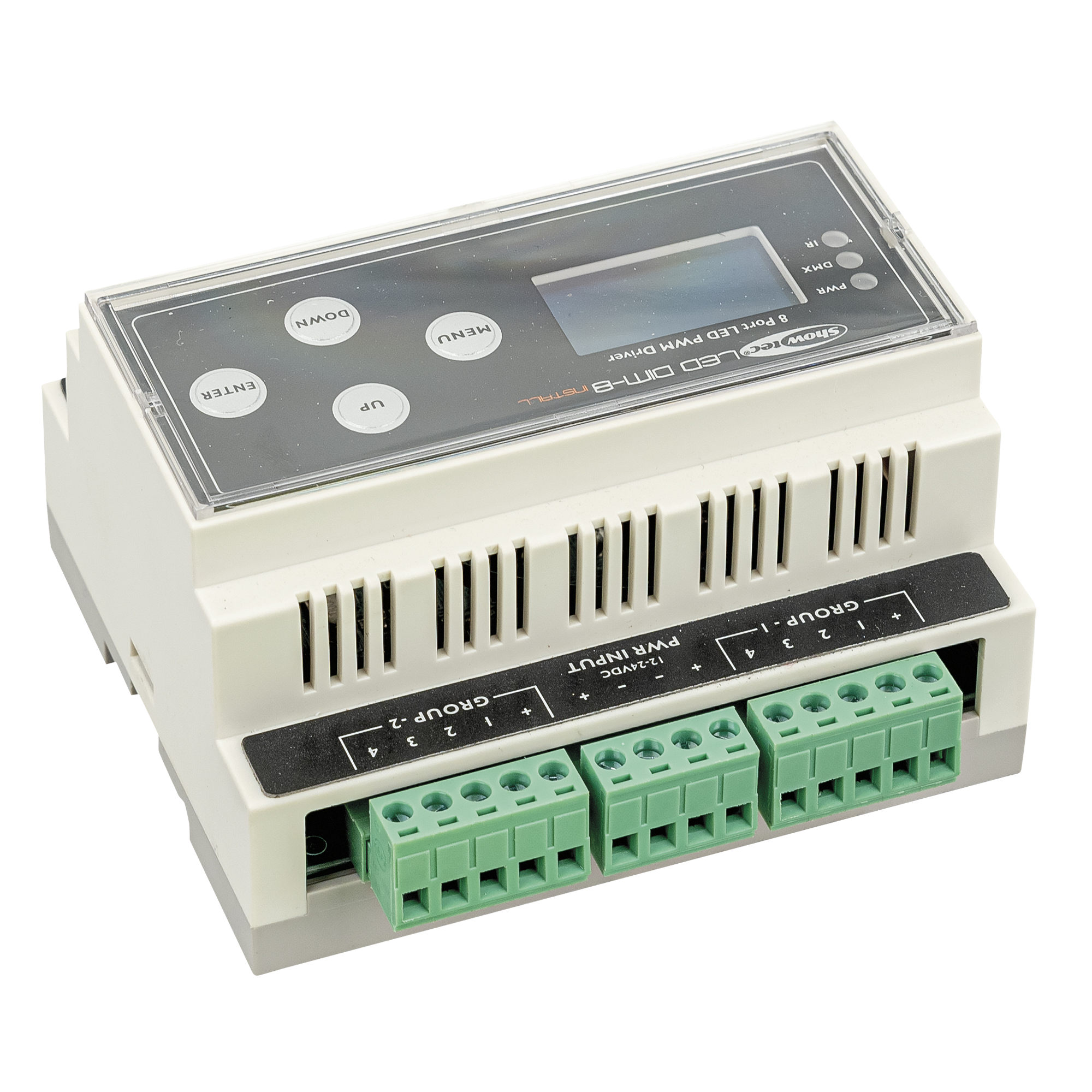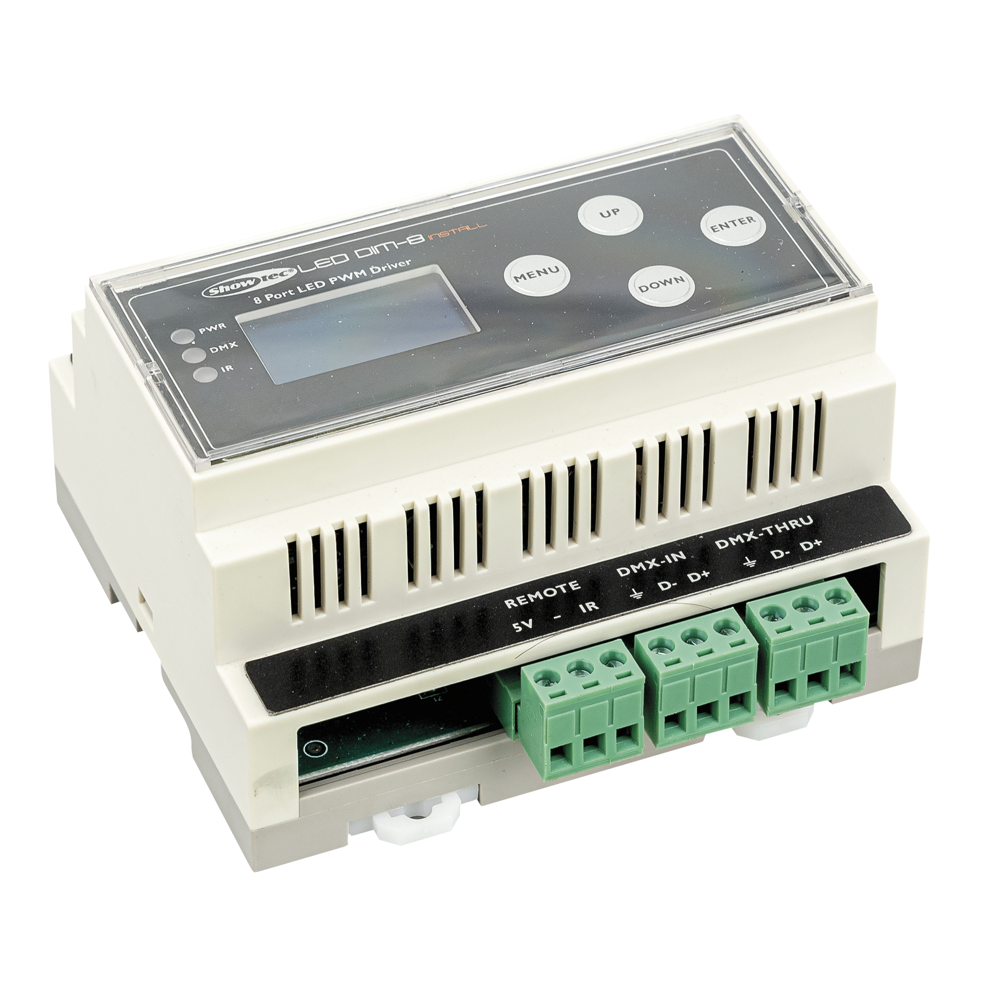 Der Showtec LED Dim-8 Install ist der ideale kompakte, fest installierte PWM-Dimmer für Sie. Alle Anschlüsse sind einfach mit den steckbaren Phoenix-Klemmen verbindbar. Der LED Dim-8 Install ist sehr benutzerfreundlich und universell konfigurierbar für verschiedene LED-Streifen. Er kann 12V bis 24V Konstantspannungsstreifen per DMX steuern oder als eigenständiger Controller für einzelne Szenen und Lauflichter verwendet werden. Die Benutzerschnittstelle ist sehr benutzerfreundlich durch ein hochwertiges O-LED-Display. Sie kann maximal 8A Einzelkanalstrom und 25A maximalen Gesamtstrom verarbeiten. Die auf einer Din-Schiene montierte LED Dim-8 steuert Ihre RGBW-Streifen und ist ideal für Projekte zur Integration von Netzwerksystemen.