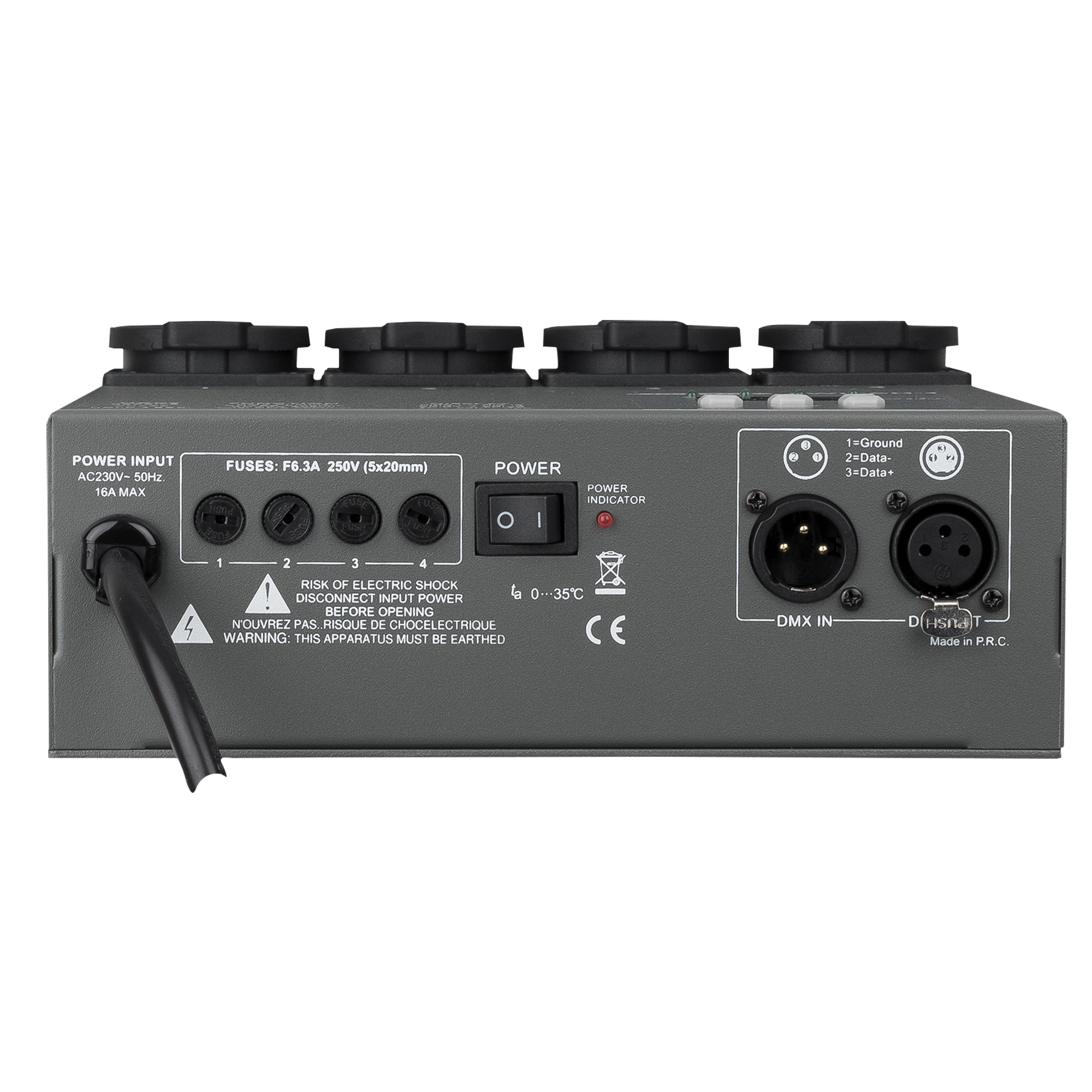 DMX-512 Switch-Pack mit 4 Kanälen, 16 eingebauten Programmen sowie anderen nützlichen Funktionen: Lauflicht-Geschwindigkeit, Stand-Alone und Master-Slave.