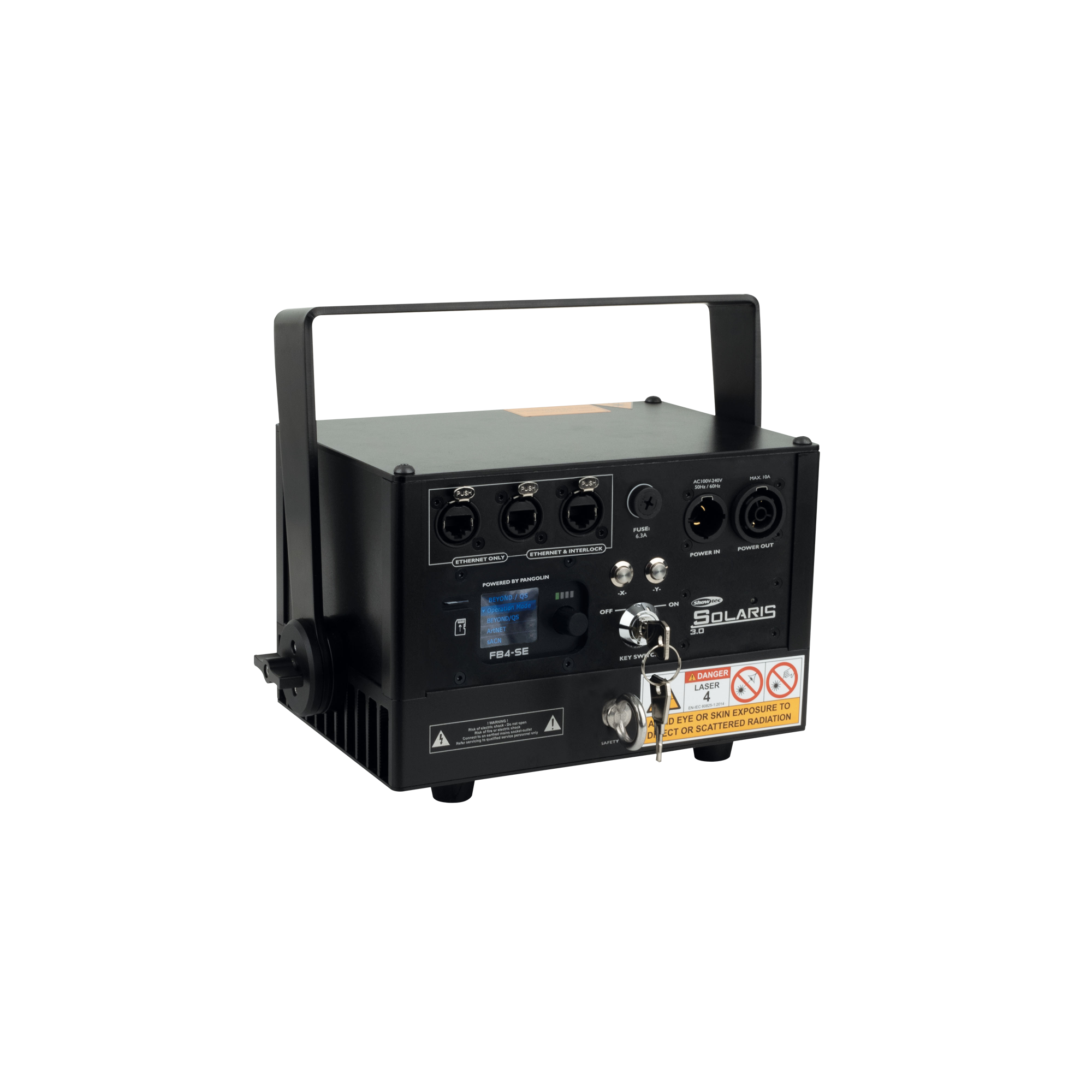 Der Solaris 3.0 ist einHigh-Power 3.000-mW-RGB-Laserprojektor mit integriertem Pangolin-FB4-Steuermodul, der für den Einsatz in großen Veranstaltungsräumen vorgesehen ist. Das FB4-Modul schaltet die preisgekrönte QuickShow-Software frei, d. h. Sie können diese professionelle Software völlig kostenlos nutzen. Damit eröffnen sich umfangreiche Möglichkeiten für die professionelle Steuerung von Lasershows. So können Sie Ihre Lasershows in einem vollständigen Netzwerk-Setup laufen lassen, gesteuert von der QuickShow-Software auf Ihrem PC. Sie können ihn auch über Ihr Lichtpult per Art-Net oder ILDA steuern, und er verfügt über eine SD-Kartenschnittstelle zur Speicherung automatischer, eigenständiger Wiedergaben.