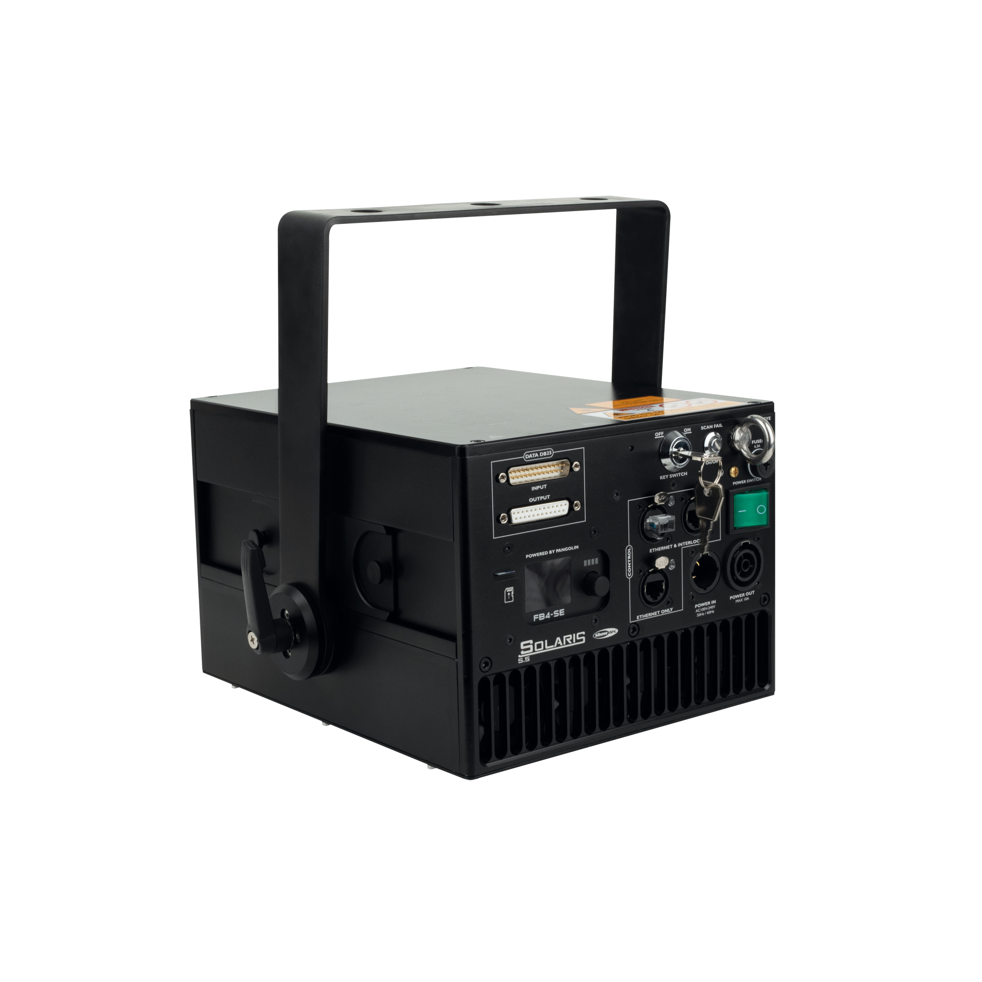 Der Solaris 5.5 ist ein High-Power 5.500-mW-RGB-Laserprojektor mit integriertem Pangolin-FB4-Steuermodul, der für den Einsatz in großen Veranstaltungsräumen vorgesehen ist. Das FB4-Modul schaltet die preisgekrönte QuickShow-Software frei, d. h. Sie können diese professionelle Software völlig kostenlos nutzen. Damit eröffnen sich umfangreiche Möglichkeiten für die professionelle Steuerung von Lasershows. So können Sie Ihre Lasershows in einem vollständigen Netzwerk-Setup laufen lassen, gesteuert von der QuickShow-Software auf Ihrem PC. Sie können ihn auch über Ihr Lichtpult per Art-Net oder ILDA steuern, und er verfügt über eine SD-Kartenschnittstelle zur Speicherung automatischer, eigenständiger Wiedergaben.