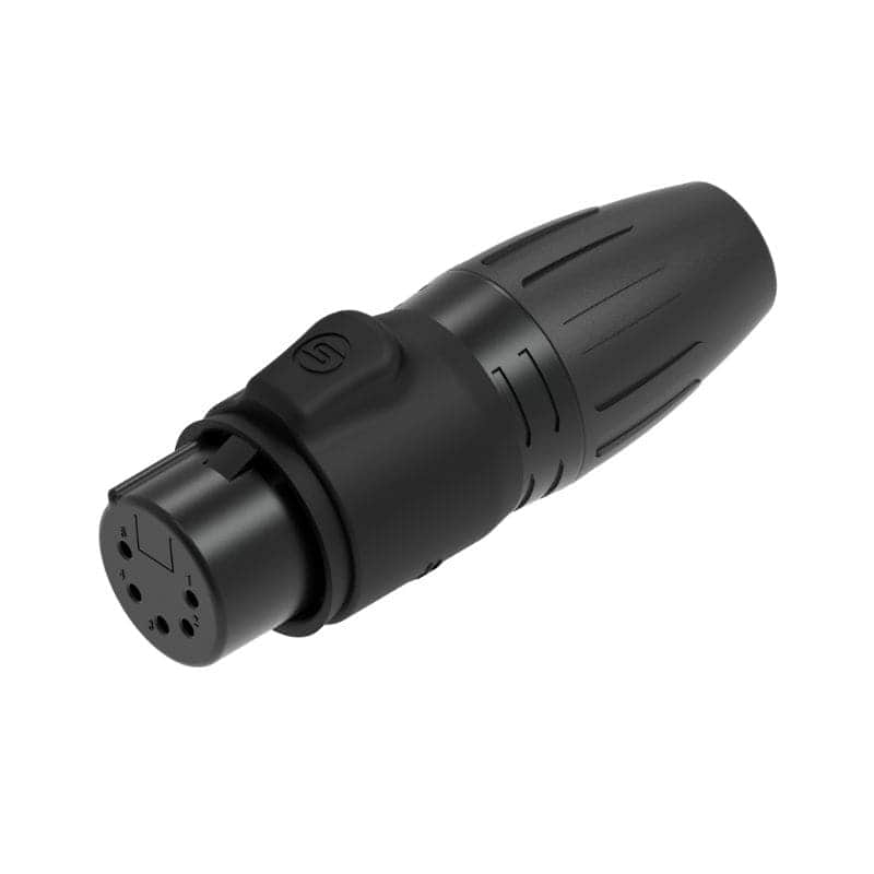 Seetronic SCWF5-B is a professional 5-pin XLR female cable connector designed for reliable signal transmission in demanding lighting and control applications. Built with a rugged black-plated zinc alloy housing and gold-plated contacts, it ensures stable connectivity and excellent signal integrity for professional DMX systems.