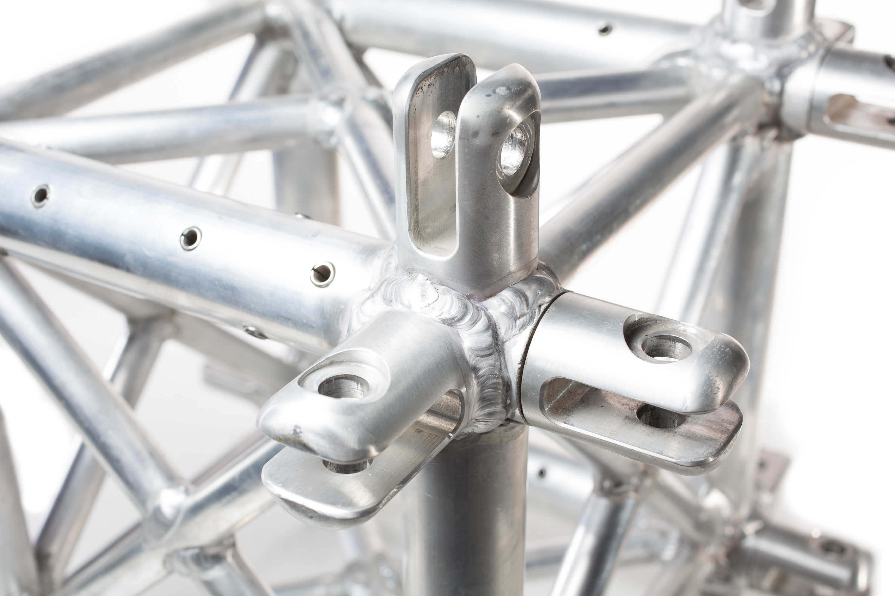 An allen M-Type-Eckelementen von Global Truss engineered by Camco sind die Gabelverbinder für die zwei horizontalen Abgänge in Richtung der Haupttragrohre eingesplintet - die Verbinder für die anderen horizontalen und vertikalen Abgänge sind angeschweißt.