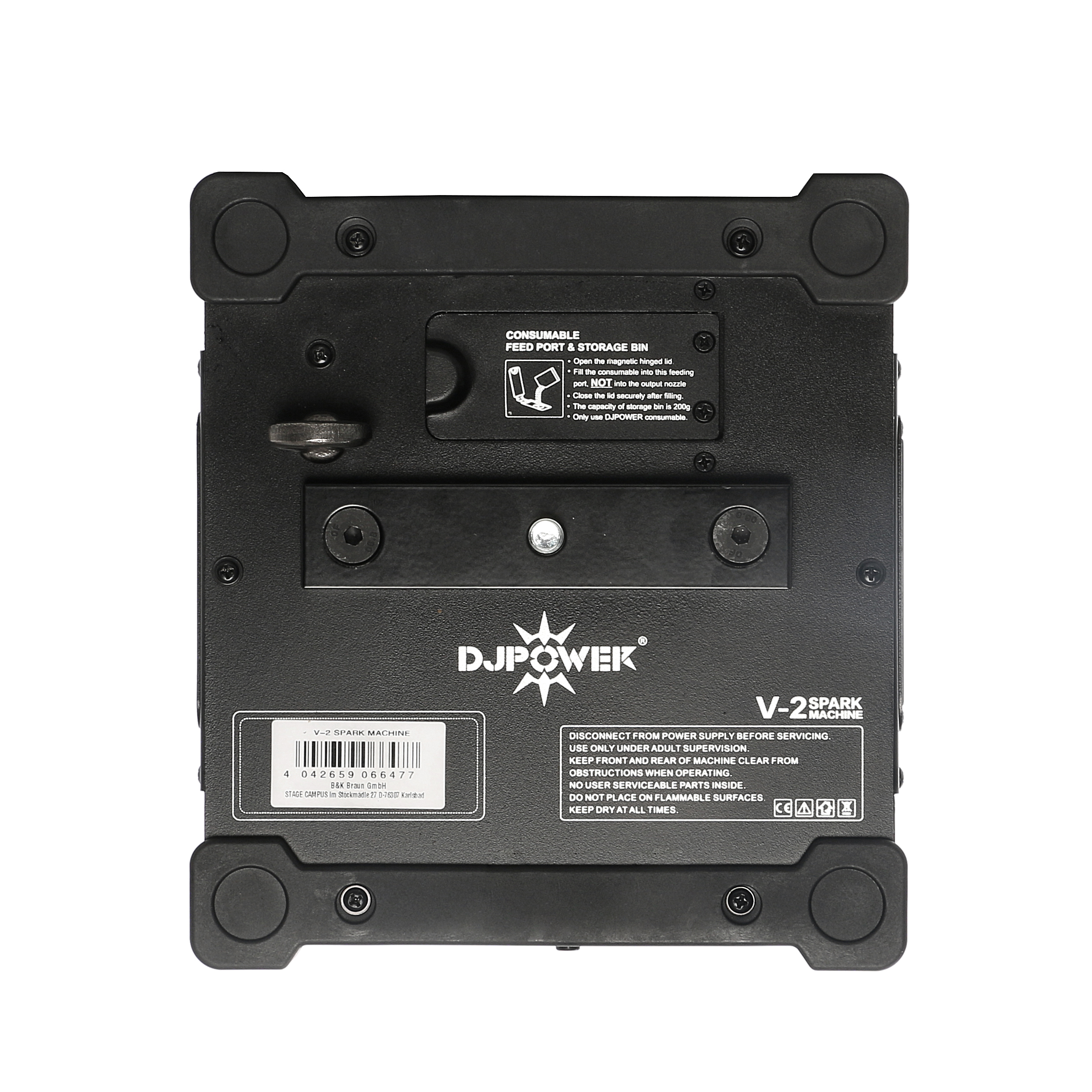Um für die maximale Sicherheit während des Betriebs zu sorgen schaltet der Spark nach 30 Sekunden im Dauerauswurf automatisch ab und kann dann wieder aktiviert werden. Mit dem Spark V-2 darf nur das entsprechende DJ Power Granulat verwendet werden. Dieses wird mit einer speziellen Schlüsselkarte geliefert, die das Gerät zur Nutzung freischaltet.