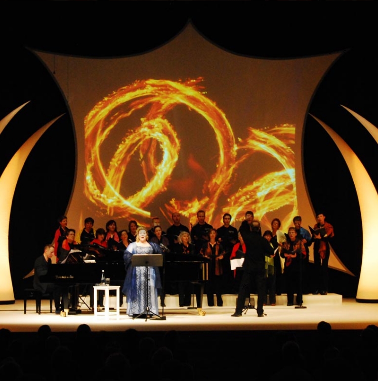 Die großen Bühnensegel können den gesamten Bühnenbereich überspannen und gleichzeitig als Projektions- oder Lichtspielfläche genutzt werden. Durch zusätzliche Spannpunkte können die Segel auch an spezielle Bühnenarchitekturen angepasst werden.