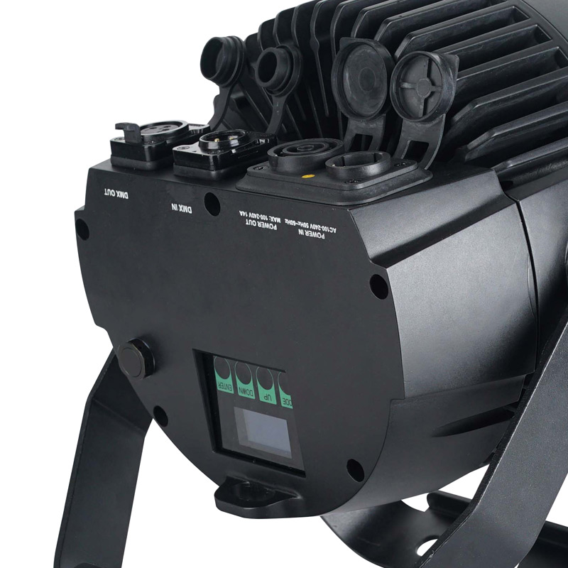 12P HEX IP professional features include: 6 DMX modes, 5 operational modes, 5 dimming curves, flicker free operation and a 4-Button DMX menu with digital display. The unit is equipped with IP65 Locking Power and IP rated 3-pin DMX rubber covers and connectors.