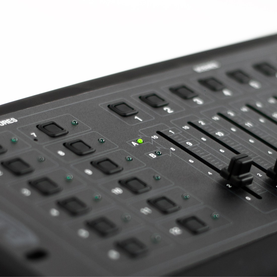 ADJ's DMX Operator Controller has 12 individual fixture buttons which allow you to control up to 12 separate intelligent lighting fixtures of up to 16 DMX channels each. With ADJ's DMX Operator Controller, you can record up to 6 chases with separate fade times and step speeds. The 8 individual channel faders provided you with easy controllability of any DMX512 moving light.