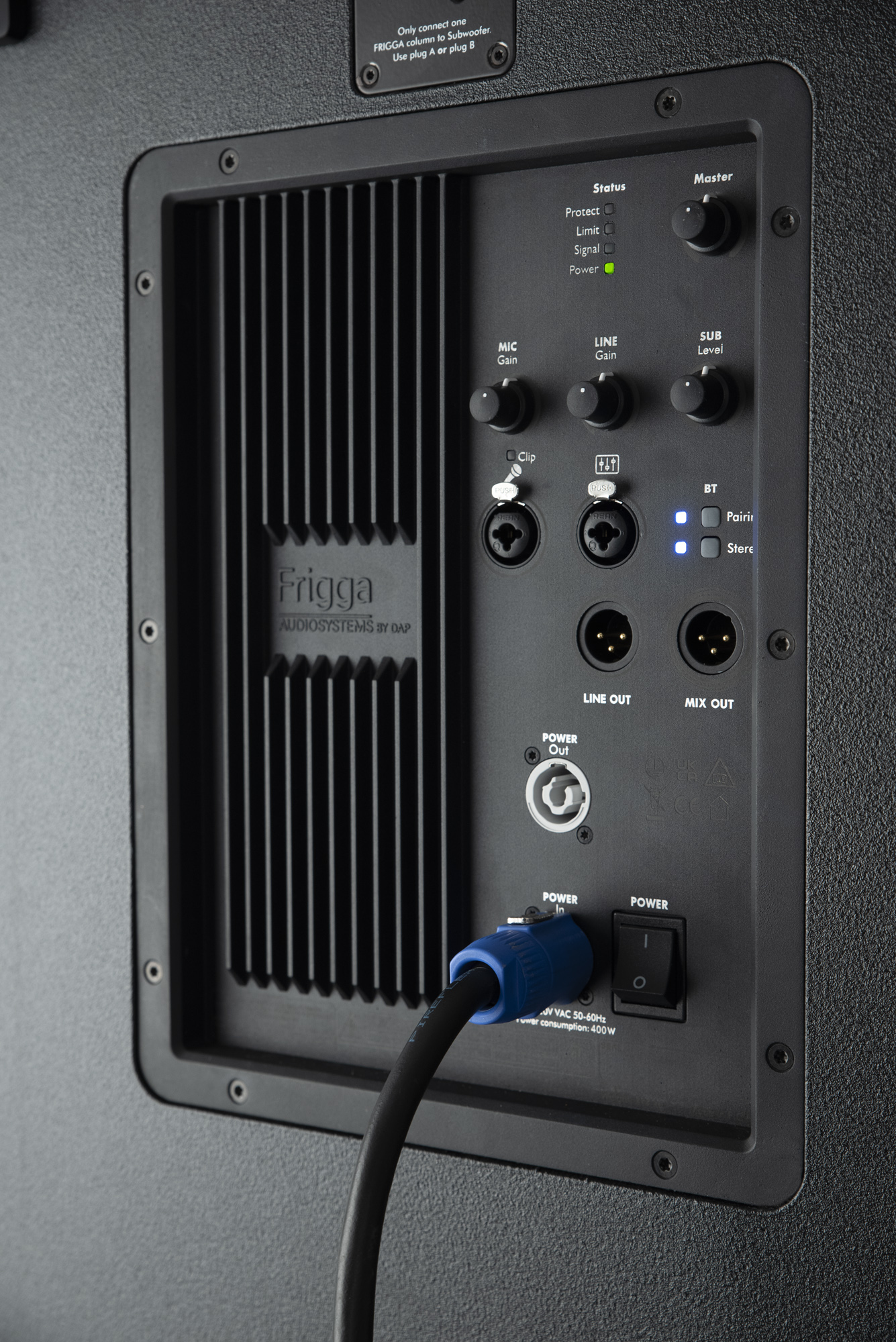 Die DAP Frigga ist ein aktives PA-Lautsprechersystem mit einem Subwoofer und einem Säulenlautsprecher, das für Singer-Songwriter, Unternehmensrepräsentanten, mobile DJs, Nachtlokale und Bands geeignet ist. Es bietet drei Eingänge: XLR-Mikrofoneingang mit Gain- und Clip-Anzeige, XLR-Line-Eingang mit Passthrough und Bluetooth mit TWS-Unterstützung. Der gemischte Ausgang kombiniert alle Signale. Mit dem SUB-Pegelregler und dem Master-Pegel werden die Balance und die Lautstärke eingestellt. Status-LEDs zeigen den Status des Verstärkers an.