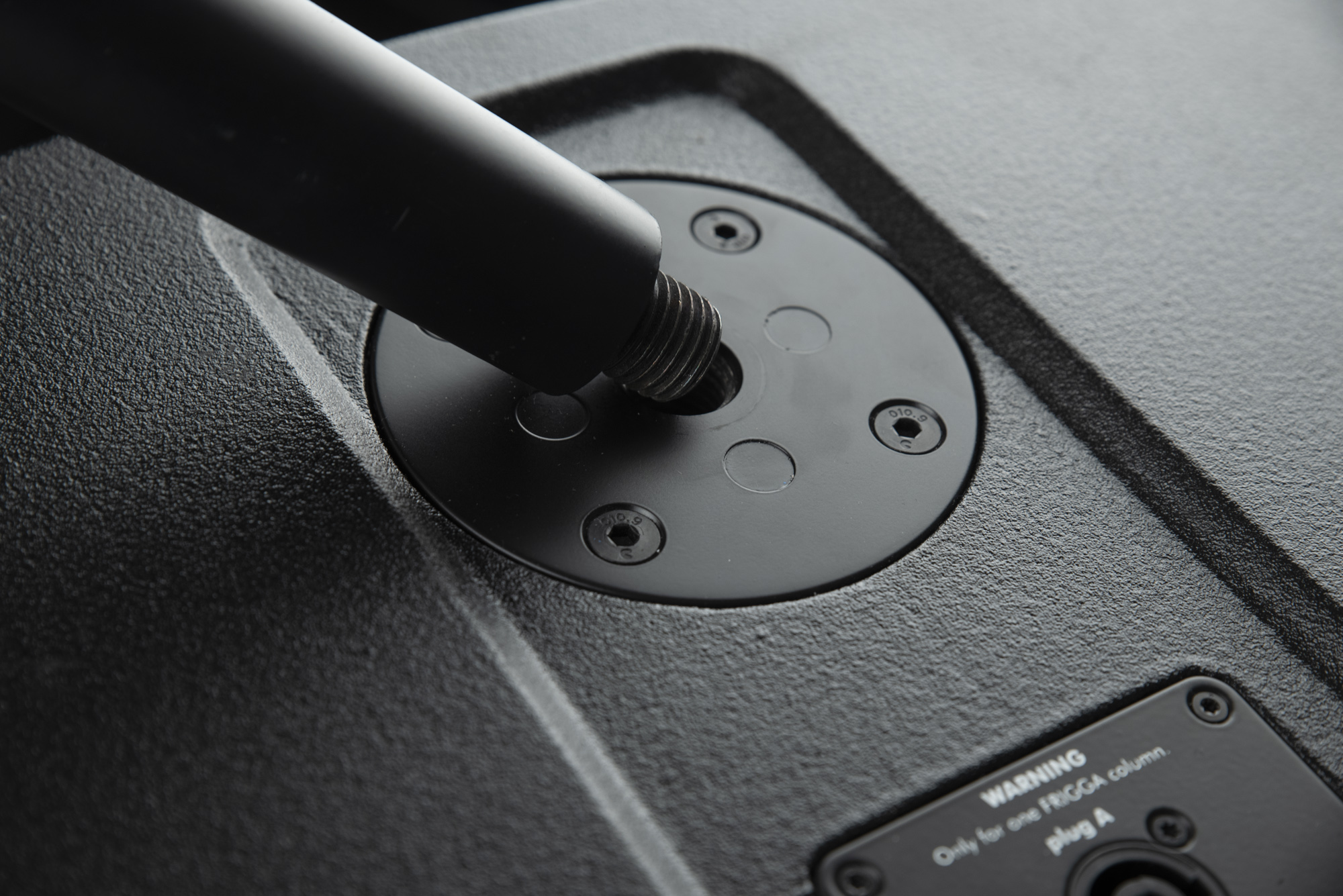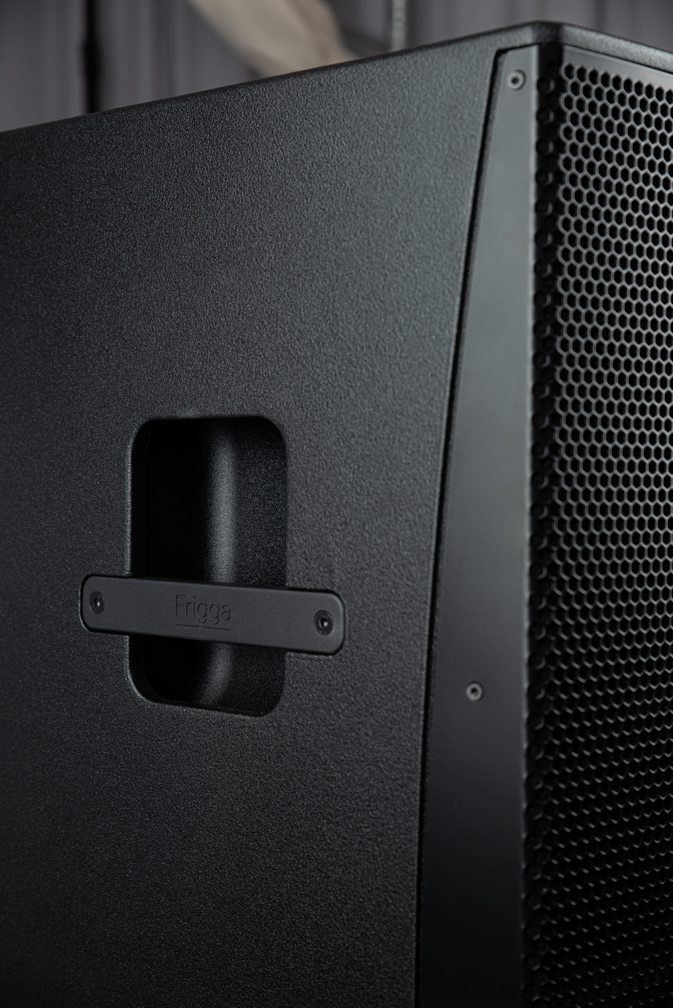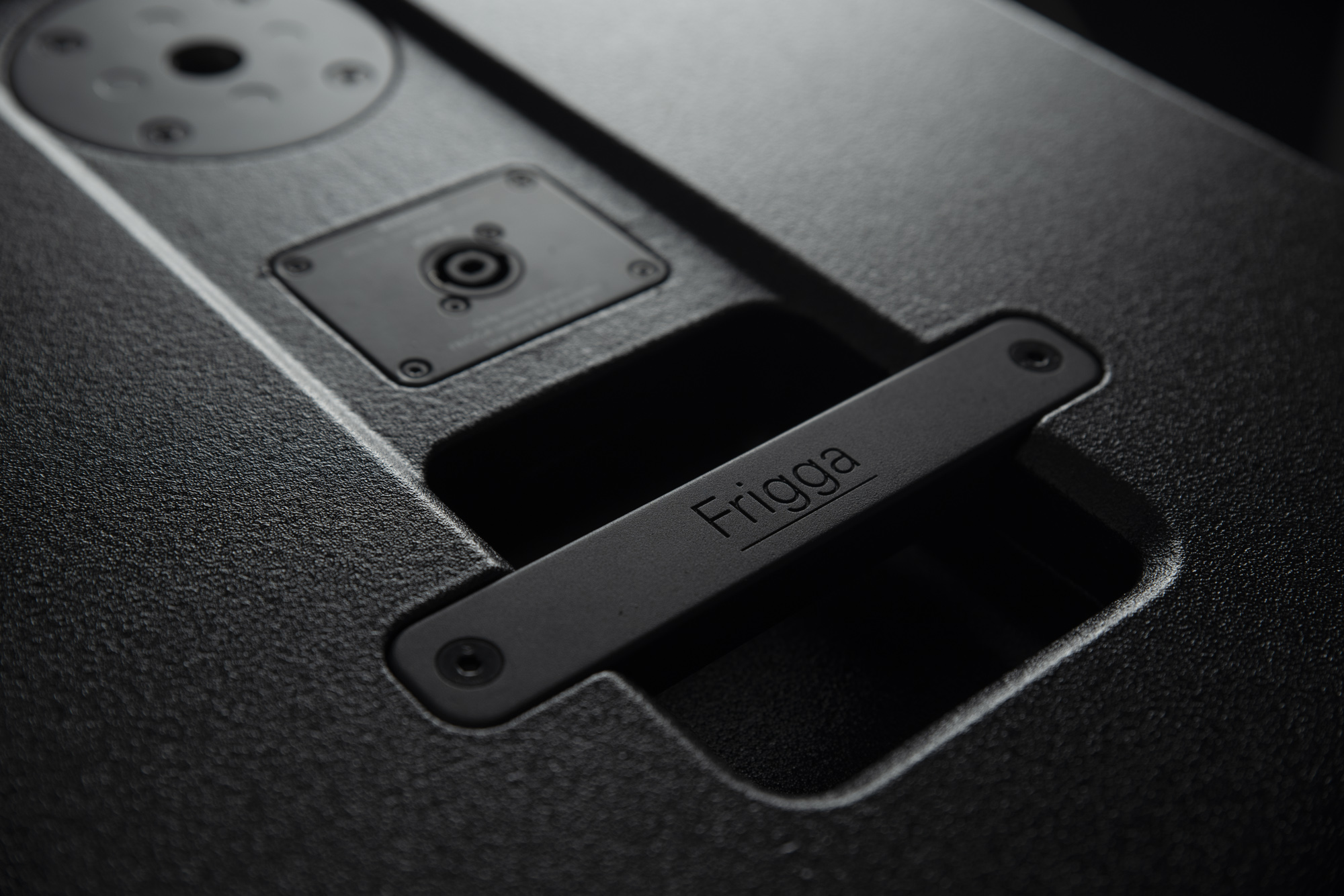Die Frigga verfügt über einen aktiven dualen 12-Zoll Subwoofer mit einem eingebauten Verstärker für den Säulenlautsprecher. Der Säulenlautsprecher enthält sechs 4-Zoll Neodym-Mitteltöner und einen 1,5-Zoll Neodym-Kompressionstreiber. Der eingebaute Verstärker liefert 1000 W RMS (2000 W Peak) über drei Kanäle. Zwei Montagestangen ermöglichen eine Höhenverstellung für verschiedene Konfigurationen.