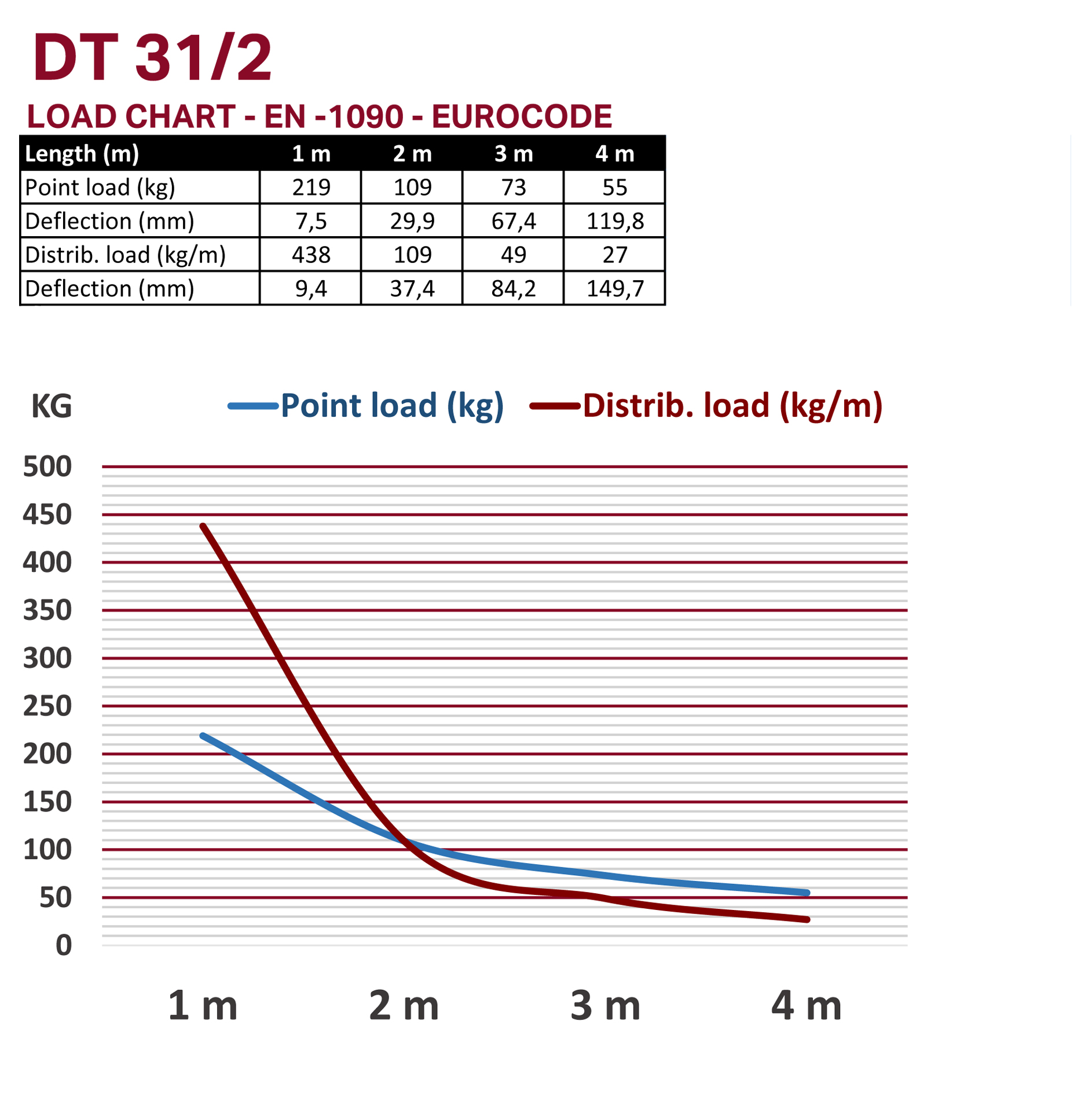 Die DT31 Serie ist ein 1-Punkt Traversensystem das auch als "Pipe" bezeichnet wird. Wie alle Systeme ist auch dieses mit einem konischen Verbinder, Bolzen und Splint ausgestattet.