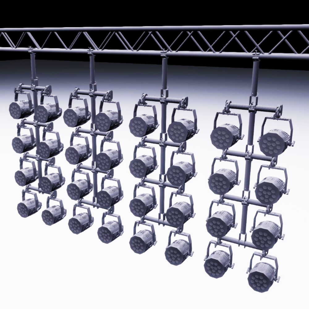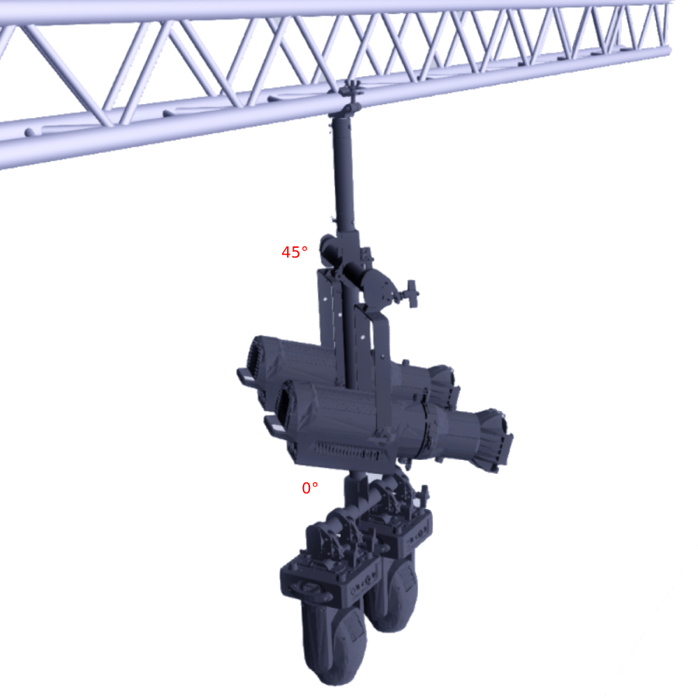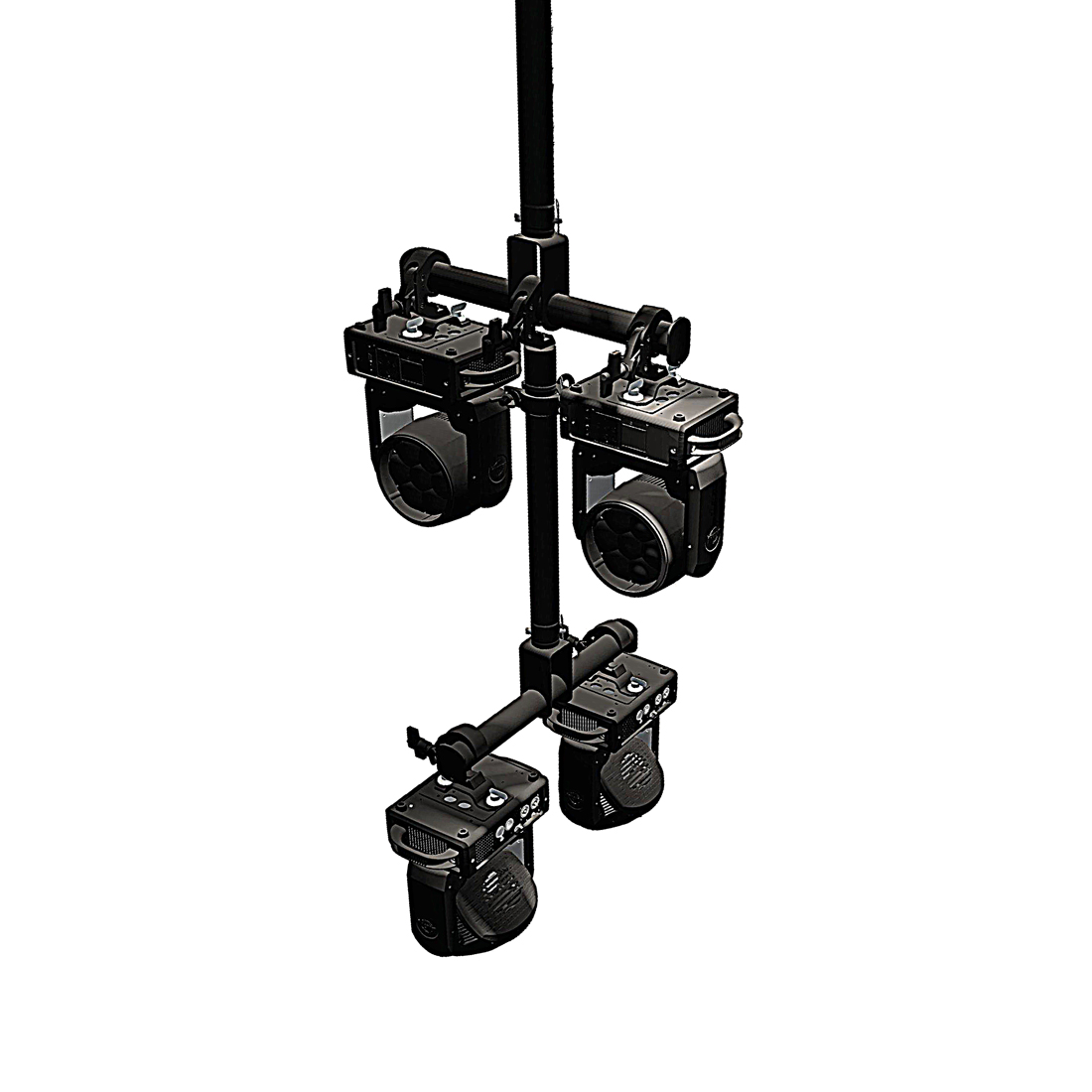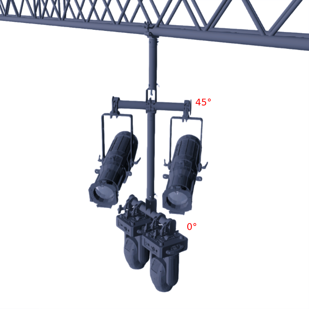Downrigger kompatibel mit DT 31/2-Rohr zum Aufhängen von Scheinwerfern an einer Haupttraverse. Ermöglicht das Aufhängen von 2 kleineren (beweglichen) Scheinwerfern nebeneinander oder eines großen Scheinwerfers mittig (mit 1 oder 2 Aufhängebügeln).