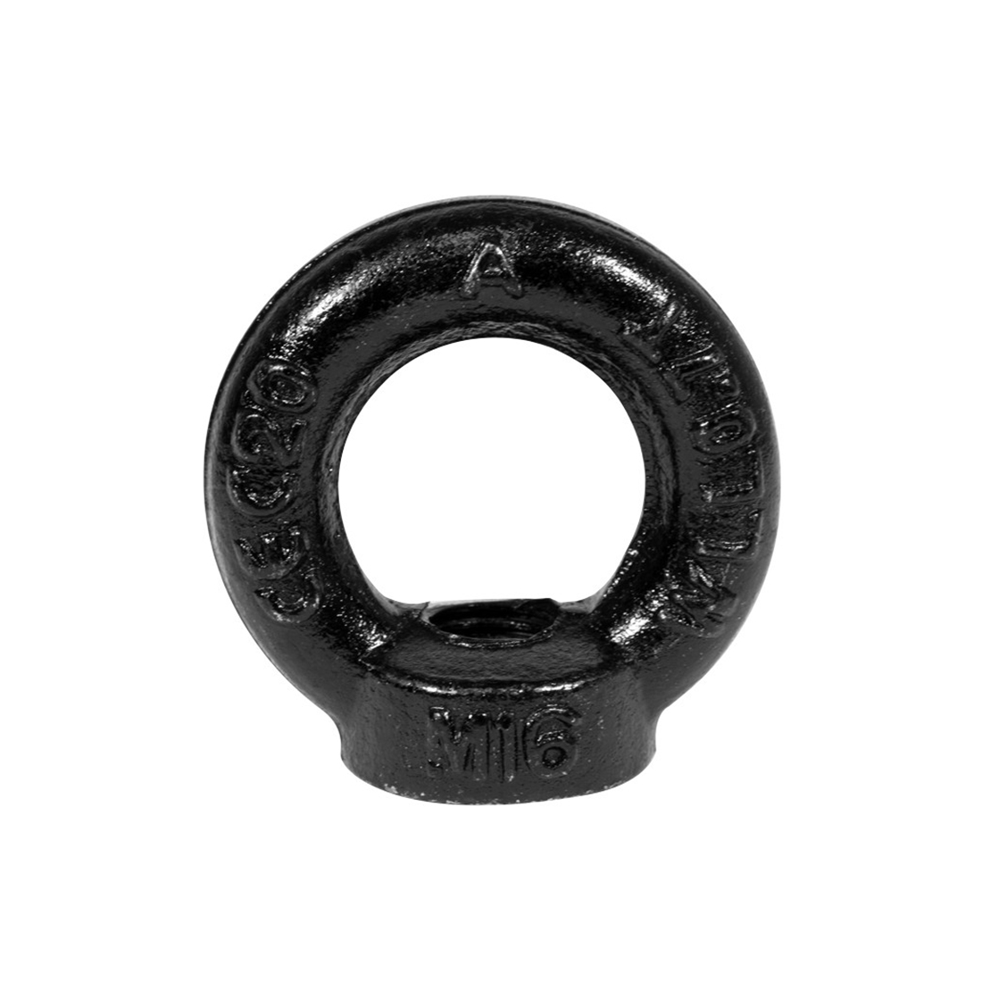 Schwarze Ringöse mit Innengewinde M16 für die Montage an Gewindestangen oder Schrauben.