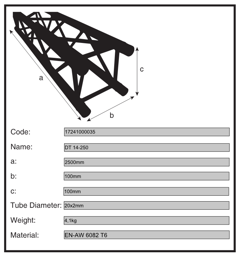 Das DT 14 System wird über einen Boxcorner verbunden der 90° Winkel in alle Richtungen ermöglicht. Zudem gibt es diverse Bodenplatten (Base Plates) und spezielle Trussaufnehmer.