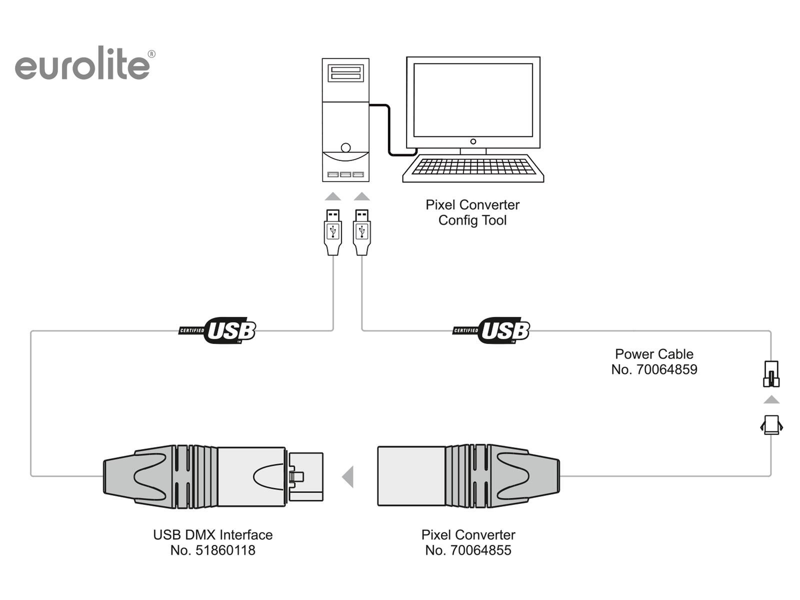 Dient zur einfachen Stromversorgung des "DXT DMX Pixel Converter PRO" während der Konfiguration an ihrem PC. Es wird kein seperates Netzteil benötig, sondern lediglich eine weiterer USB Port. Schließen sie niemals geleichzeitig einen LED Streifen an den 4poligen Anschluss des DXT DMX Pixel Convertes an, da dadurch der USB Port überlastet werden kann. Dient nur der Stromversorgung! Für die Konfiguration des "DXT DMX Pixel Converter PRO" wird zusätzlich ein "USB-DMX512-Interface/Upload Adapter" (51860118) benötigt!