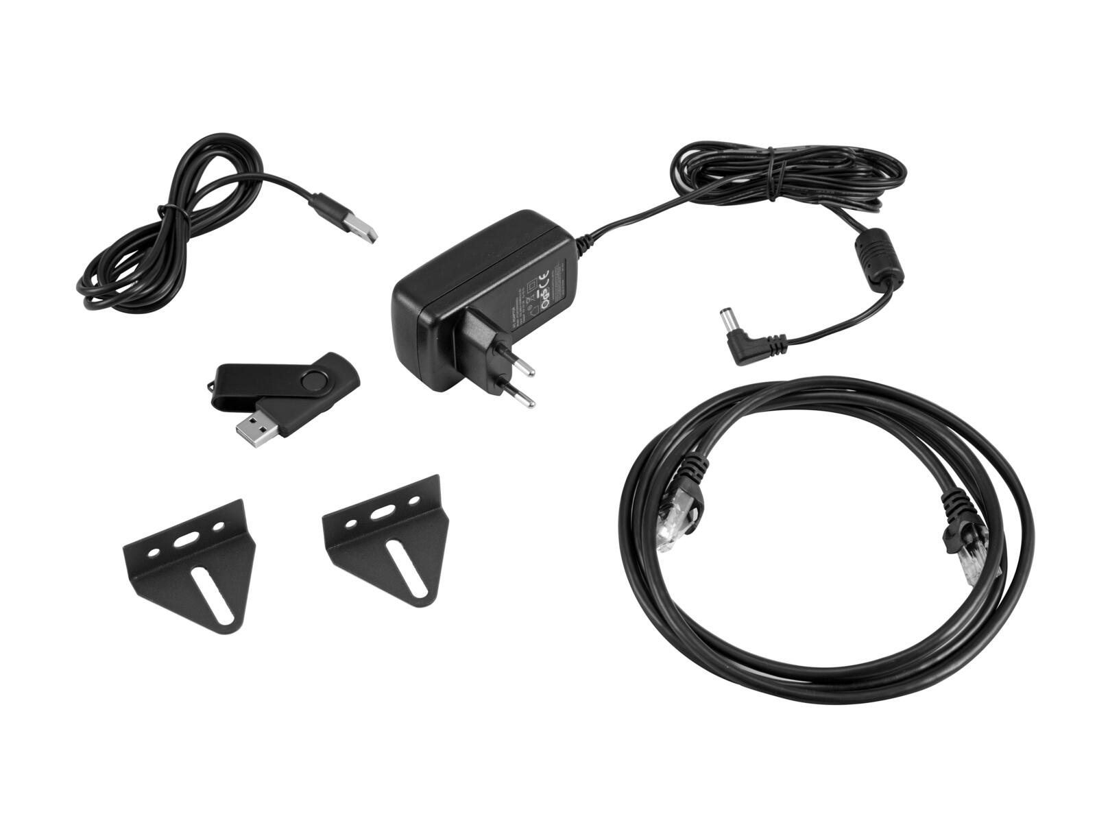 - 1 x Gerät, 1 x Externes Netzteil, 1 x USB-Stick, 1 x Fernbedienung, 1 x USB-Kabel, 1 x Netzwerkkabel, 2 x Winkel, 2 x Batterie