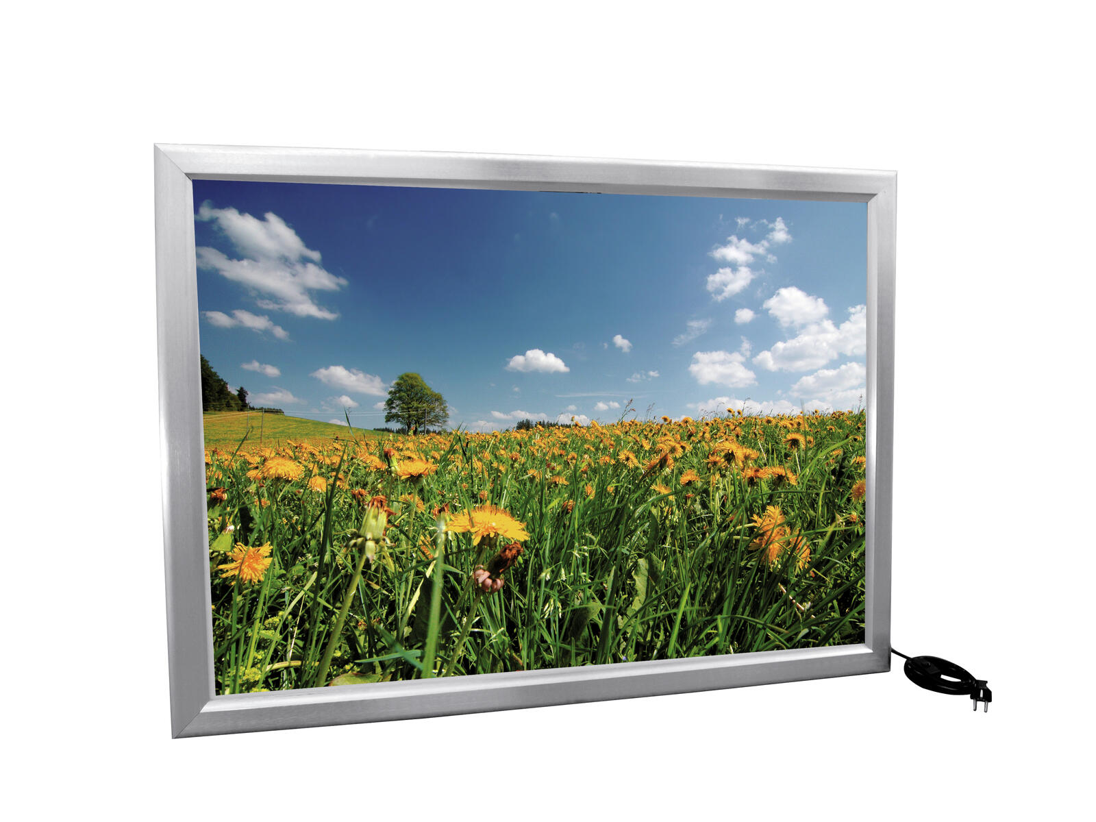 Licht an!Lassen Sie Ihre Plakate strahlen. Wie? Mit unserer beleuchteten Reklamewand. Nur wenige Handgriffe sind nötig, um Ihre Poster oder Plakate zu wechseln. Sie müssen nur den Rahmen nach außen klappen, das Plakat unter die transparente Kunststoffscheibe legen und den Rahmen wieder zuklappen. Licht an! Fertig! Der Klapprahmen ist ein Klassiker der Plakatwerbung. Mit der zusätzlichen Beleuchtung kommt Ihr Poster oder Plakat nun noch besser zur Geltung. Durch den edlen gebürsteten Alu-Rahmen wird Ihre Werbung optimal präsentiert. Die Acrylglasplatte schützt Ihre Plakate vor Verunreinigungen und Verbleichen. Dabei lassen sich die Rahmen einfach an der Wand befestigen und können sowohl horizontal als auch vertikal aufgehängt werden. Zudem sorgt die hochwertige Verarbeitung sorgt dafür, dass die Klemmen auch nach häufigem Öffnen noch zuverlässig schließen. Die Reklamewand ist auch in A3, A2, A1 und einer Größe von 2 m² erhältlich.