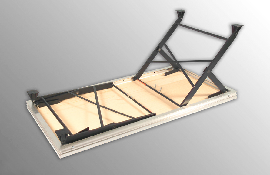 Scherenpodest gefertigt aus Aluminiumrahmen mit flächenbündig einliegender, fest verschraubter Abdeckplatte. Standardmäßig ausgestattet mit einer Tischlerplatte 22 mm, braun lasiert. Scherenkonstruktion aus Rechteckstahlrohr, stoß- und kratzfest kunststoffbeschichtet (standardmäßig schwarz). Die umlaufende Montage-Nut dient der Verbindung der Podeste untereinander und zur Befestigung von Zubehör wie Treppen, Schutzgeländern, Verblendungen u. v. m.