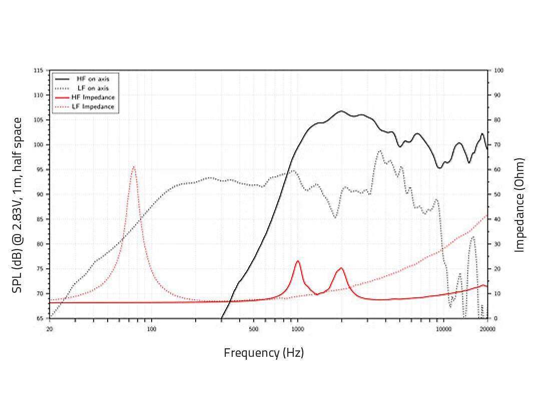 200 W AES LF/35 W AES HF, 8 Ohm LF/8 Ohm HF, 96 dB LF/103,5 dB HF, 75-5500 Hz LF/1500-20000 Hz HF